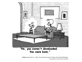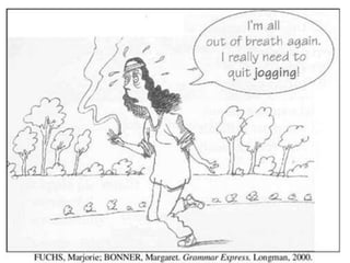 O documento contém um cartum sobre alguém que precisa parar de fumar, seguido por perguntas sobre o cartum e o texto. As perguntas testam a compreensão do leitor sobre o que está sendo questionado no cartum e no texto, e sobre a função de um texto anunciando um novo produto.