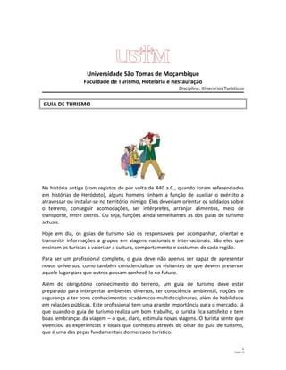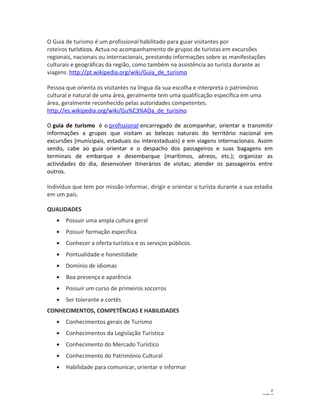 O documento discute a história e papel dos guias de turismo. Os guias auxiliavam exércitos antigos a atravessar territórios inimigos e hoje orientam turistas sobre cultura e costumes locais. Um guia deve ter conhecimento do terreno, habilidades de relações públicas e consciência ambiental para proporcionar uma boa experiência aos visitantes.
