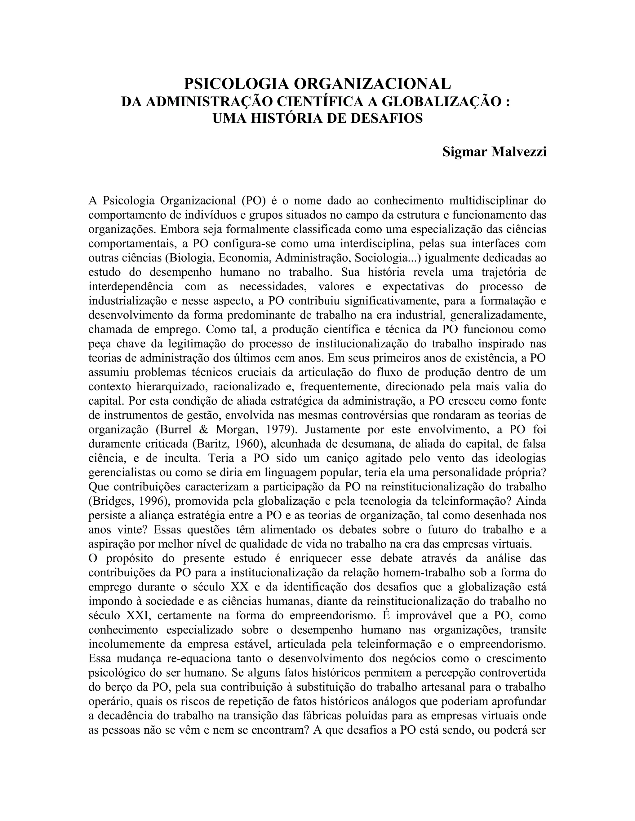 1) A Psicologia Organizacional surgiu no início do século XX para estudar o comportamento humano no trabalho e aumentar a produtividade nas fábricas.