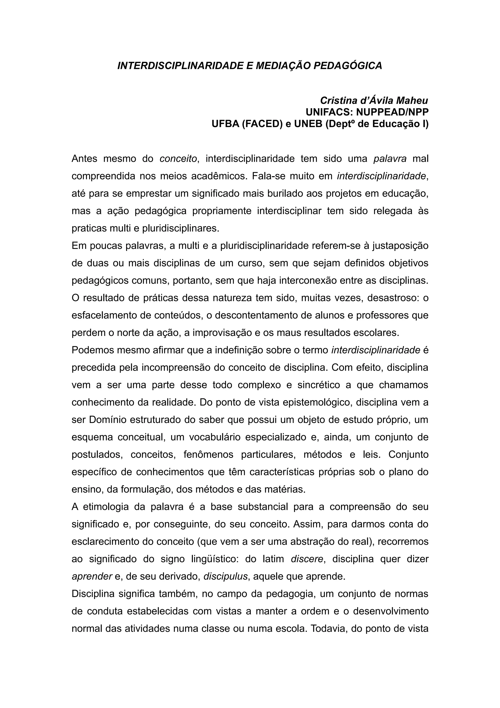 Este documento discute a interdisciplinaridade e mediação pedagógica. Primeiro, define os conceitos de disciplina, interdisciplinaridade, pluridisciplinaridade e multidisciplinaridade. Segundo, faz um breve histórico da interdisciplinaridade desde a antiguidade até os dias atuais. Terceiro, discute a importância da interdisciplinaridade escolar e da mediação pedagógica.