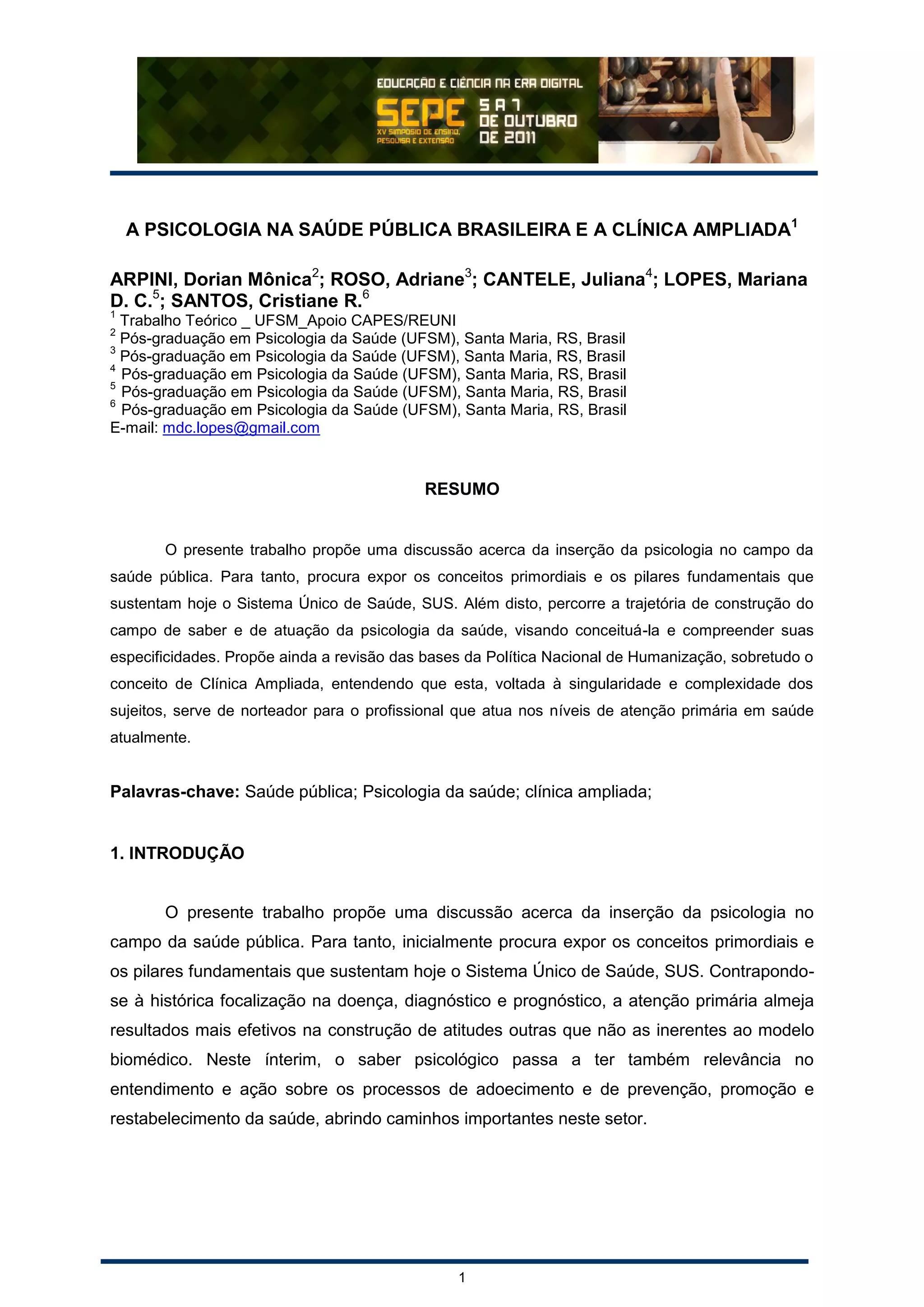 Este documento discute a inserção da psicologia no campo da saúde pública brasileira e o conceito de clínica ampliada. Primeiramente, resume os principais conceitos e pilares do Sistema Único de Saúde e a trajetória da psicologia da saúde. Em seguida, explica que a clínica ampliada, voltada à singularidade dos sujeitos, serve como guia para os profissionais da atenção primária, enfatizando a escuta, o estabelecimento de vínculos e a participação do paciente.