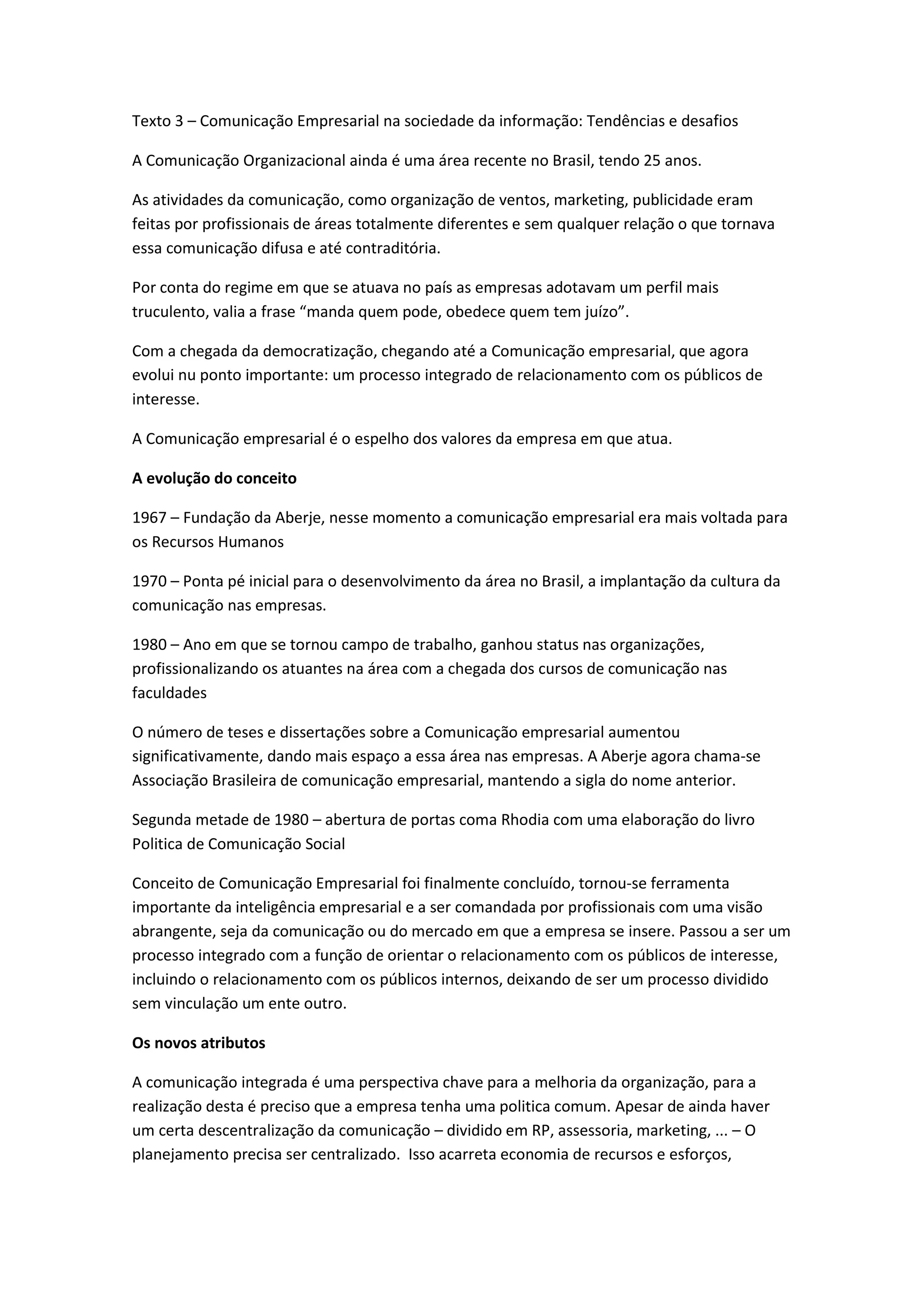 O documento descreve a evolução da comunicação empresarial no Brasil desde 1967, quando foi fundada a Aberje, até os dias atuais. A comunicação empresarial passou de função voltada para recursos humanos para campo de trabalho profissionalizado na década de 1980. Atualmente, é vista como ferramenta importante da inteligência empresarial e deve ser integrada, focada no negócio e distribuída em diversas ações e estratégias para enriquecer o contato com públicos internos e externos.