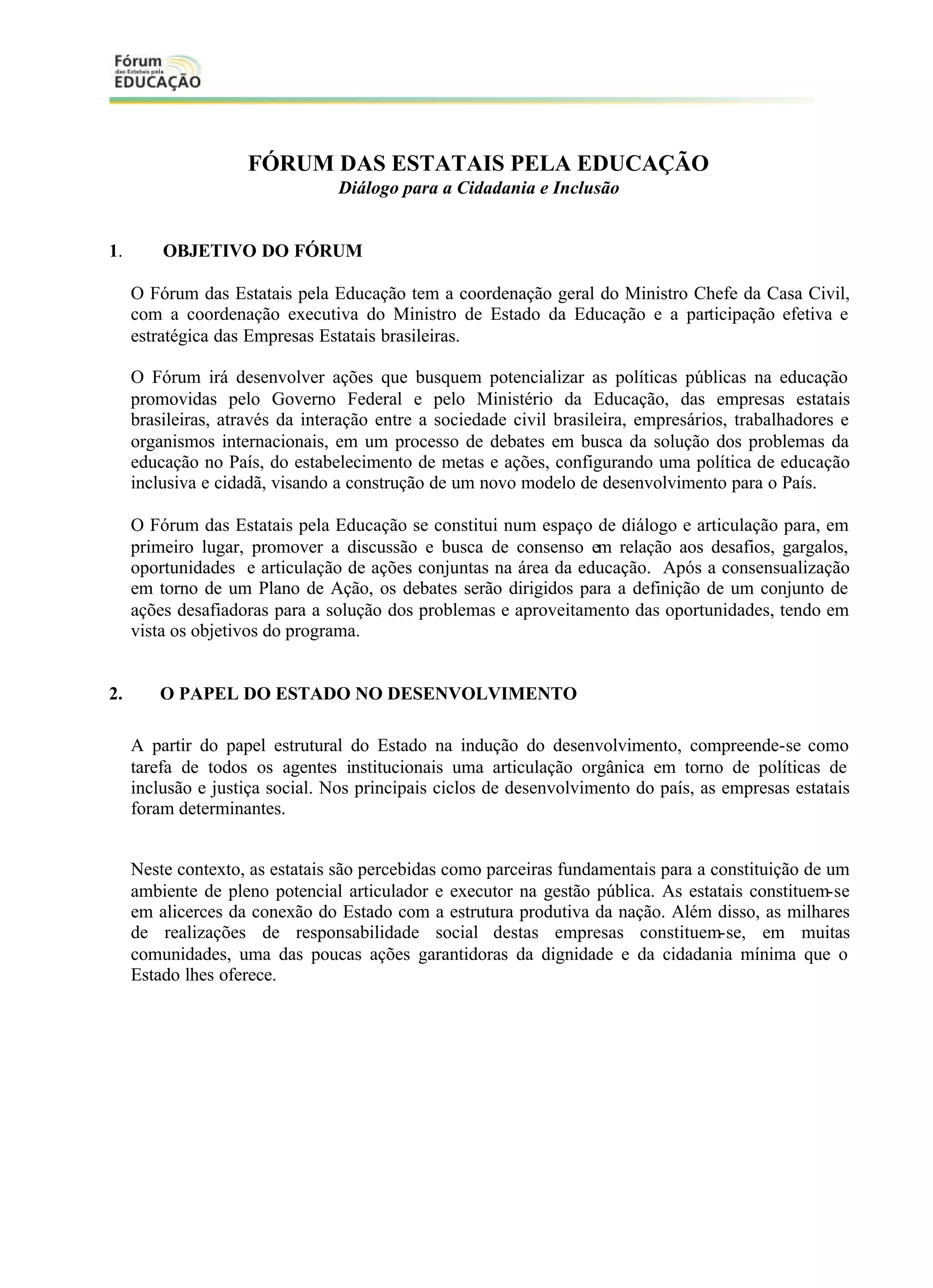 O documento descreve o Fórum das Estatais pela Educação, que tem como objetivo promover o diálogo entre o governo, empresas estatais e sociedade civil para definir políticas públicas de educação. O Fórum será coordenado pelo Ministro Chefe da Casa Civil e Ministro da Educação e contará com a participação de presidentes de estatais. Será estruturado em câmaras temáticas focadas em alfabetização, educação básica, profissional e superior.
