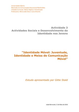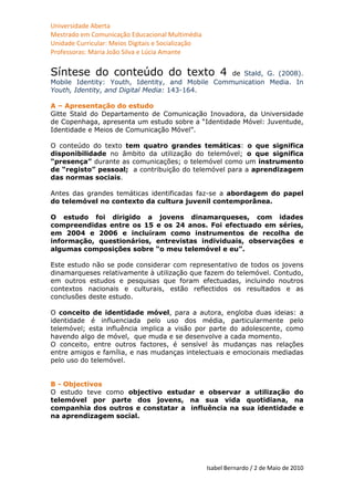 O documento resume um estudo realizado na Dinamarca sobre como os jovens usam seus telefones celulares e como isso afeta sua identidade e socialização. O estudo entrevistou jovens entre 15-24 anos e encontrou que eles se sentem sempre disponíveis através de seus telefones e os usam para manter contato com amigos. O telefone celular ajuda na aprendizagem social e na formação da identidade dos jovens.