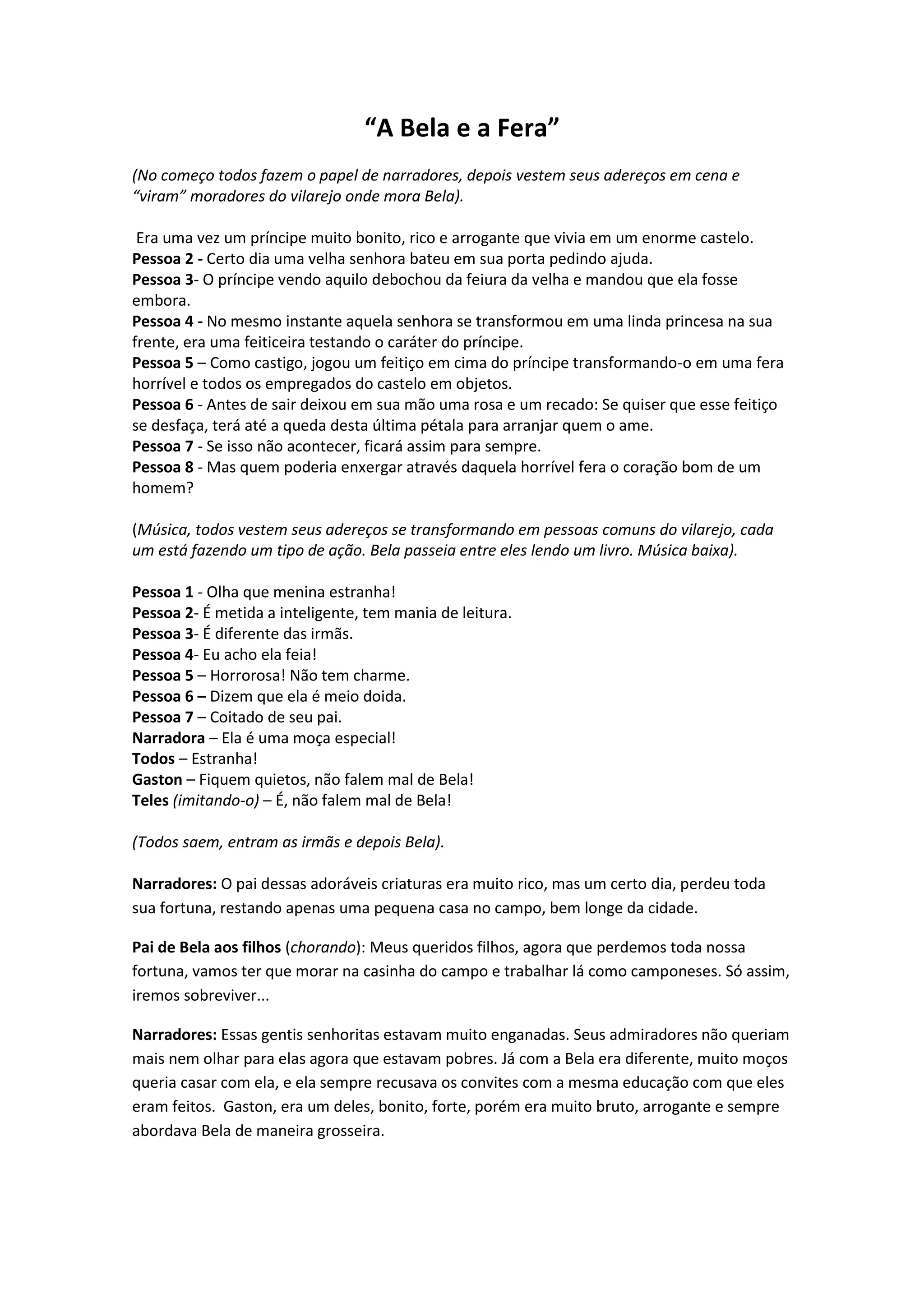 O documento resume a história de "A Bela e a Fera". Nele, um príncipe arrogante é transformado em uma fera horrível por uma feiticeira como castigo por desprezar uma velha pedinte. Anos depois, o pai de Bela se perde na floresta e encontra refúgio no castelo da Fera, que o toma como prisioneiro. Bela vai em seu resgate e oferece seu lugar no cativeiro. Com o tempo, Bela passa a ver a bondade por trás da aparência fera da criatura.