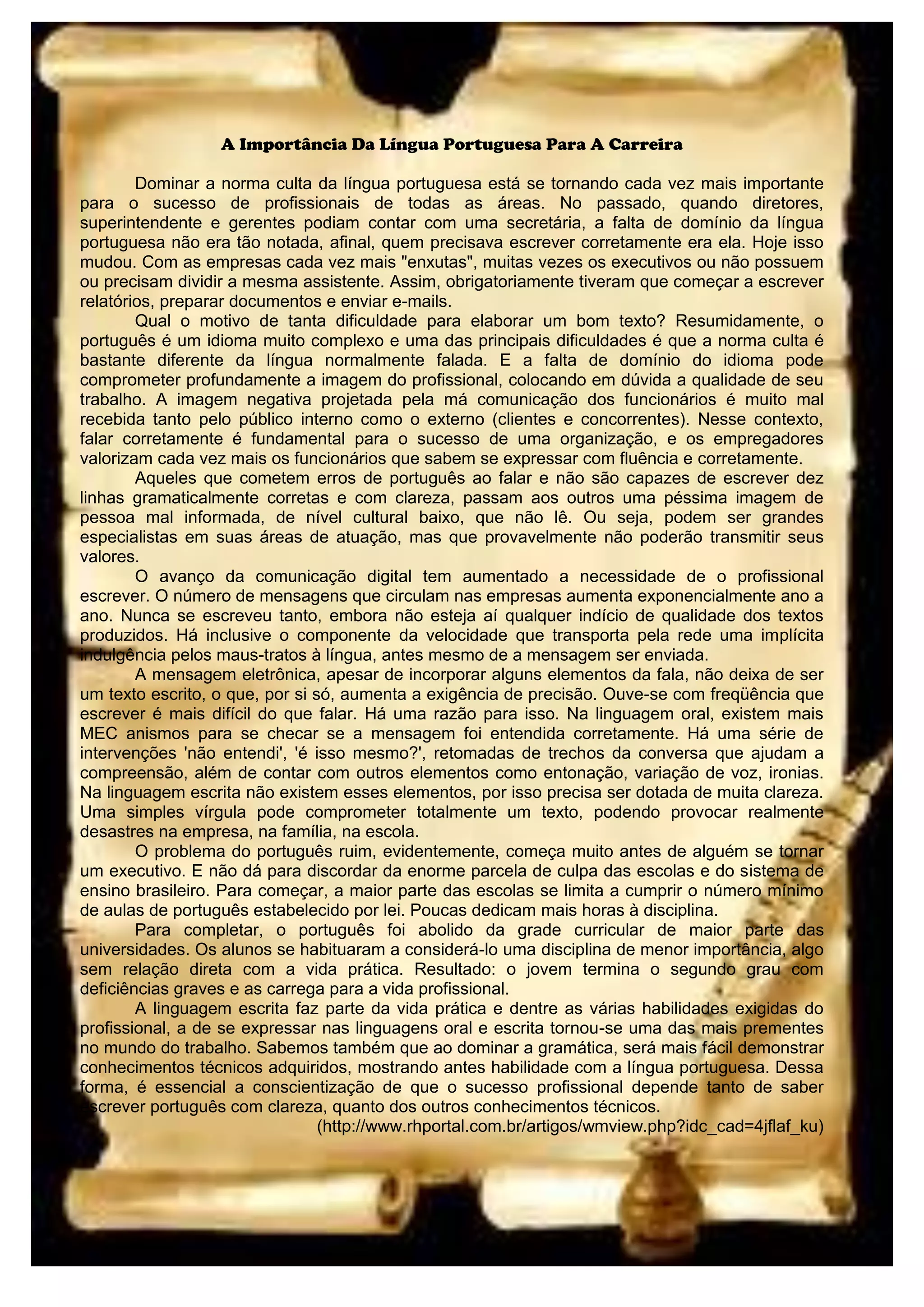 O domínio da língua portuguesa está se tornando cada vez mais importante para o sucesso profissional, já que os executivos precisam escrever relatórios e e-mails sozinhos. Erros de português prejudicam a imagem do profissional e podem colocar em dúvida sua competência. As escolas e universidades dedicam pouco tempo ao ensino da língua portuguesa, o que leva os jovens a terem deficiências na escrita.