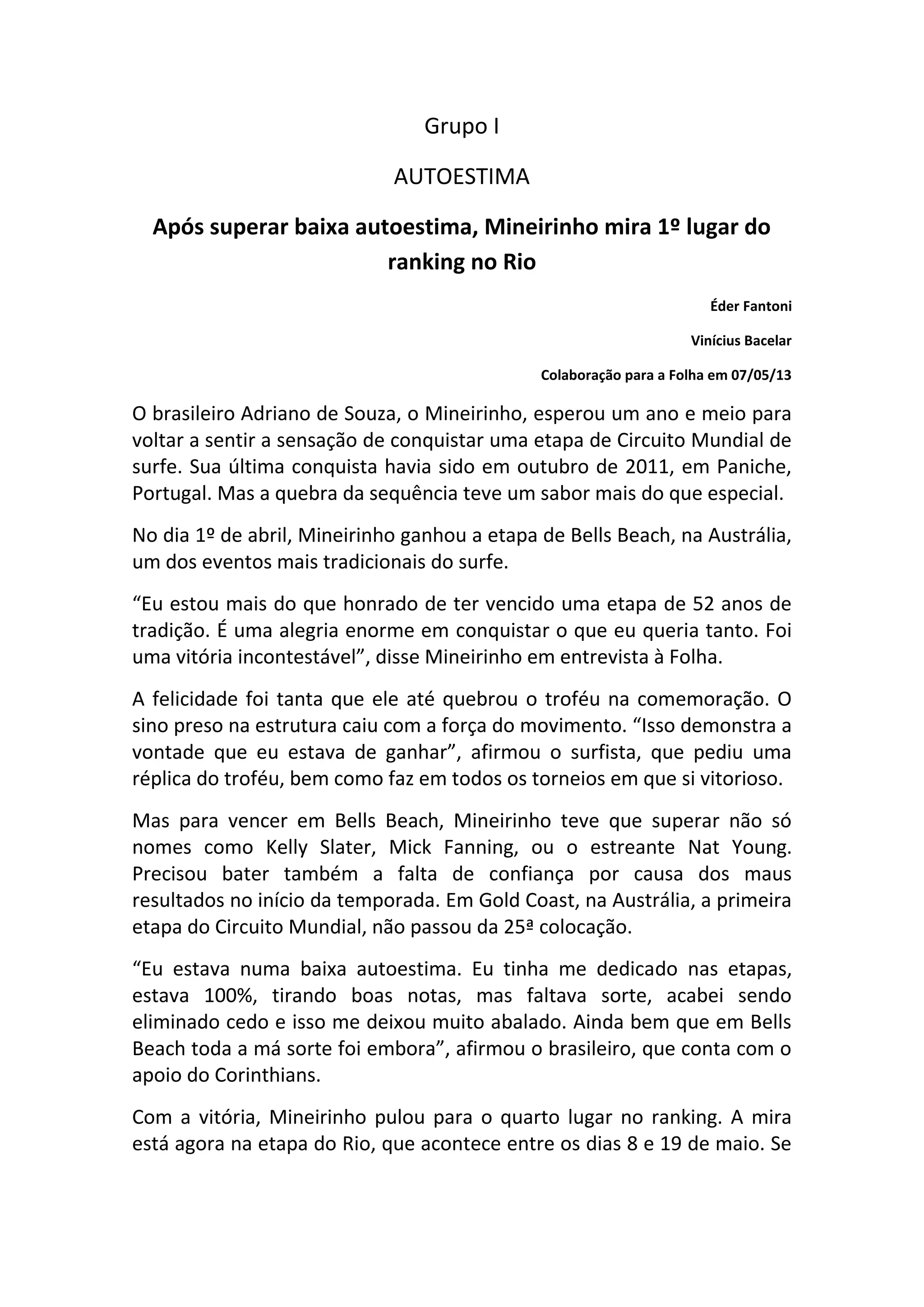 O surfista brasileiro Adriano de Souza, o Mineirinho, venceu uma etapa do Circuito Mundial de Surfe na Austrália após um ano e meio sem vitórias, superando sua baixa autoestima causada por resultados ruins no início da temporada. Agora ele mira a liderança do ranking e uma boa performance na próxima etapa no Rio de Janeiro.
