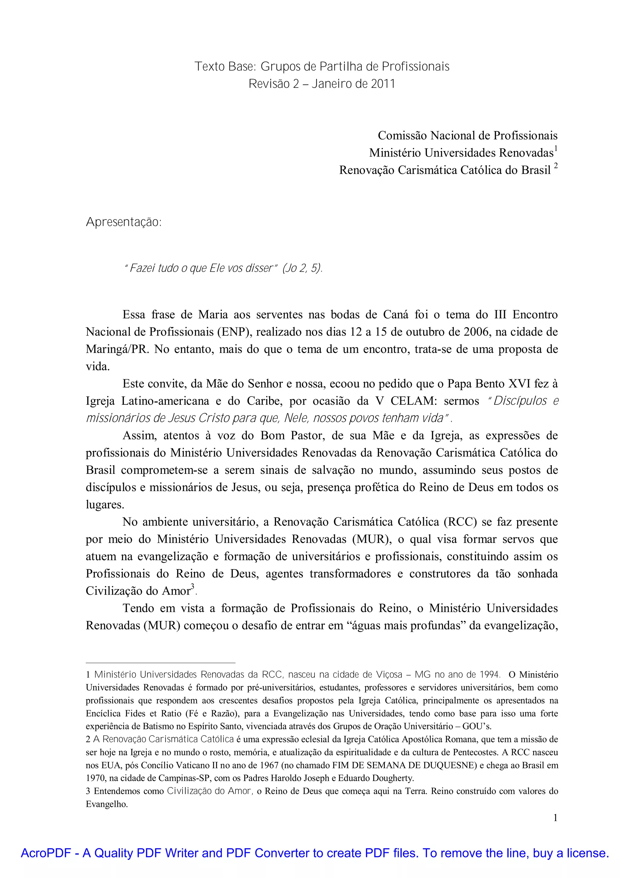 1) O documento descreve Grupos de Partilha de Profissionais (GPPs) criados por profissionais formados no Ministério Universidades Renovadas da Renovação Carismática Católica do Brasil.