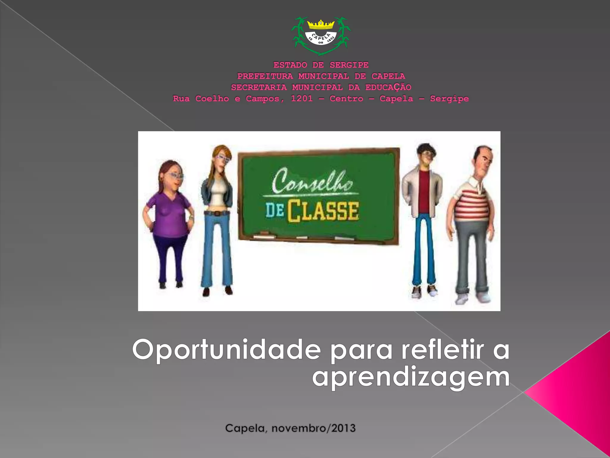 O documento discute o Conselho de Classe como um órgão colegiado na escola que reúne professores e especialistas para avaliar o desempenho dos alunos, estratégias de ensino e organização curricular. Ele permite a troca de informações e diagnósticos para melhorar os processos de ensino-aprendizagem.