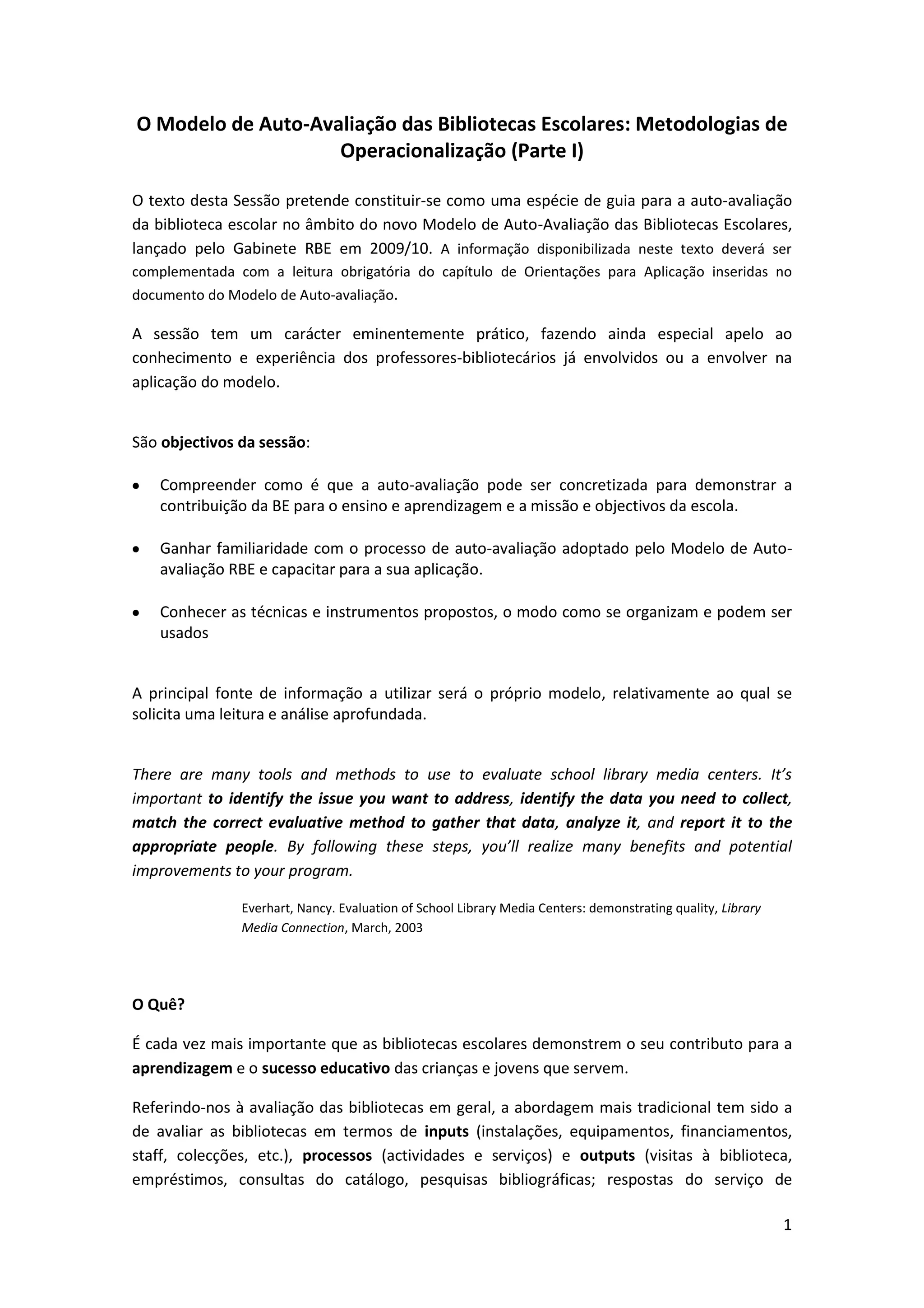O documento discute o modelo de auto-avaliação das bibliotecas escolares em Portugal, com o objetivo de demonstrar a contribuição da biblioteca para o ensino e aprendizagem. O modelo orienta-se para avaliar os resultados (outcomes) ao invés de apenas inputs, processos e outputs. A auto-avaliação deve estar alinhada com a avaliação geral da escola e o modelo de avaliação externa das escolas portuguesas.