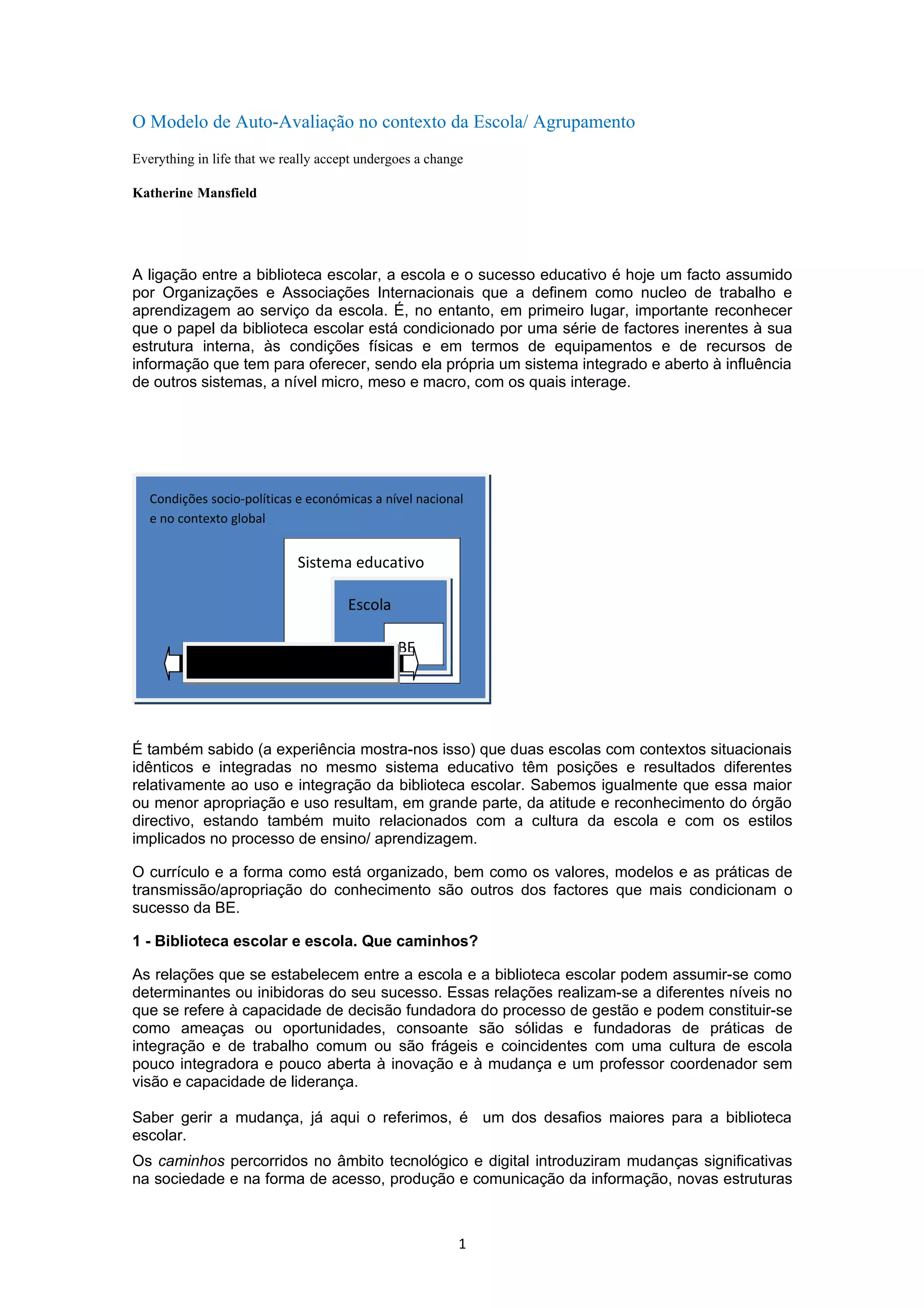 1) O documento discute a importância da auto-avaliação da biblioteca escolar no contexto da escola, identificando fatores-chave como a liderança do coordenador e a integração dos objetivos da biblioteca nos planos estratégicos da escola.