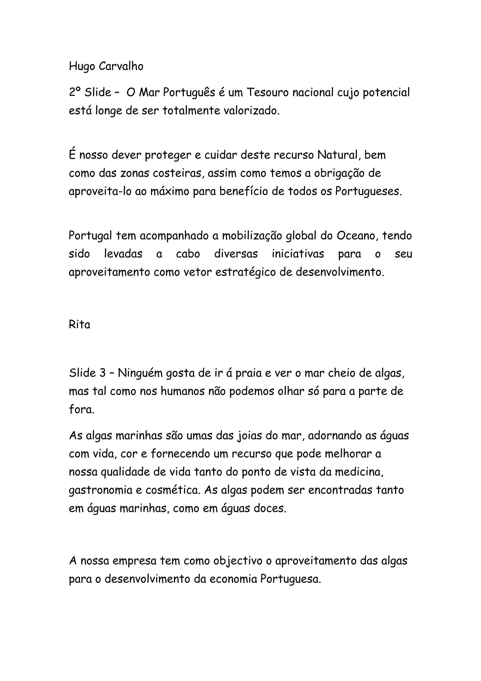 O documento discute o potencial das algas marinhas em Portugal, propondo seu uso em vários setores como alimentação, cosméticos e fertilizantes. A empresa também planeja desenvolver projetos de energia renovável a partir do movimento das ondas, instalando quatro tipos de dispositivos em locais específicos na região da Nazaré.