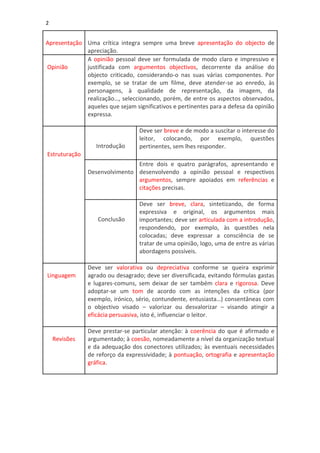 Este documento fornece instruções para escrever uma apreciação crítica em 3 partes: introdução, desenvolvimento e conclusão. Apresenta o objeto de forma breve na introdução e defende uma opinião com argumentos no desenvolvimento. A conclusão resume os pontos principais de forma expressiva.