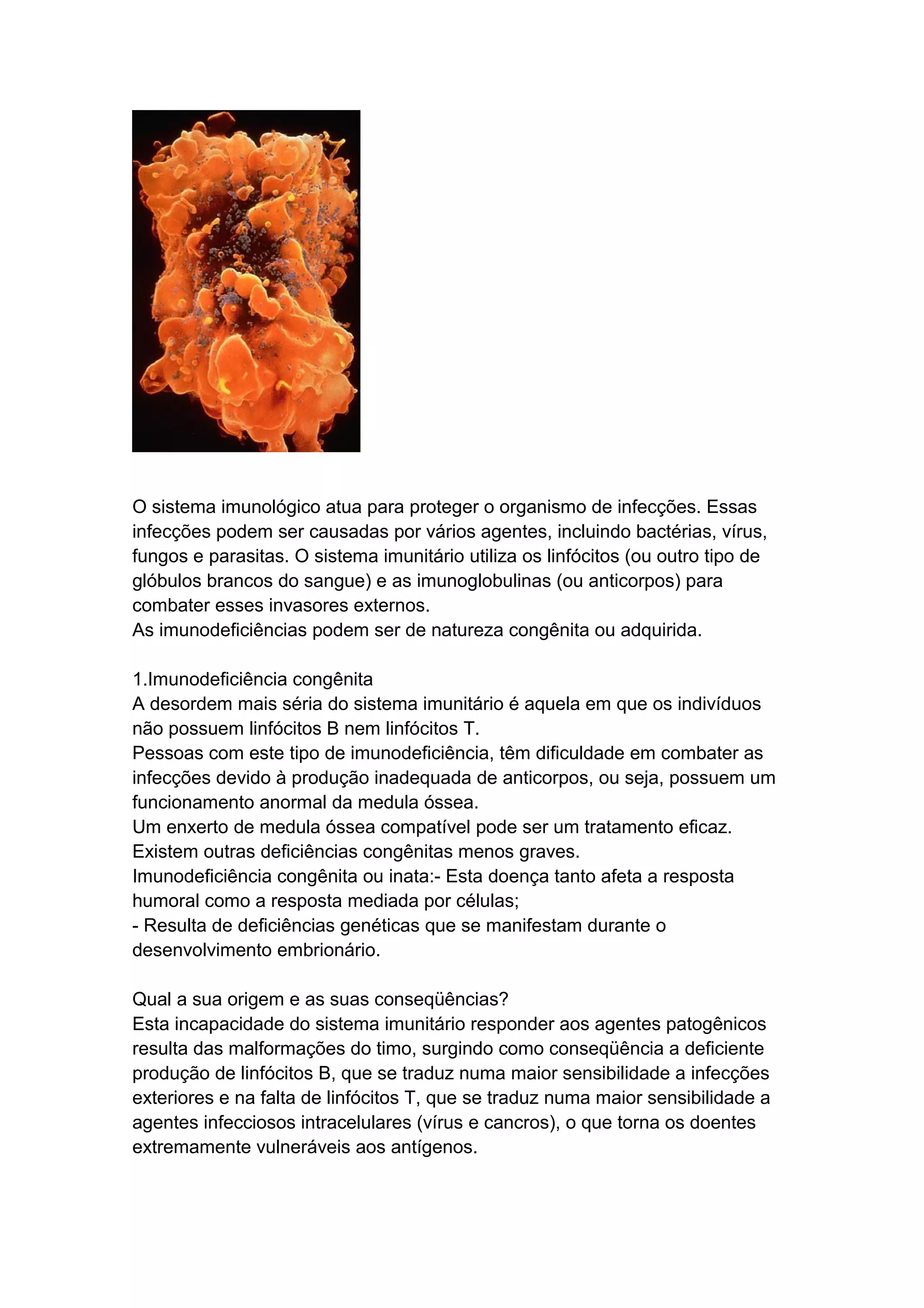 O documento discute o sistema imunológico e imunodeficiências. Apresenta as imunodeficiências congênita e adquirida, destacando a Síndrome da Imunodeficiência Adquirida (AIDS) causada pelo vírus HIV.