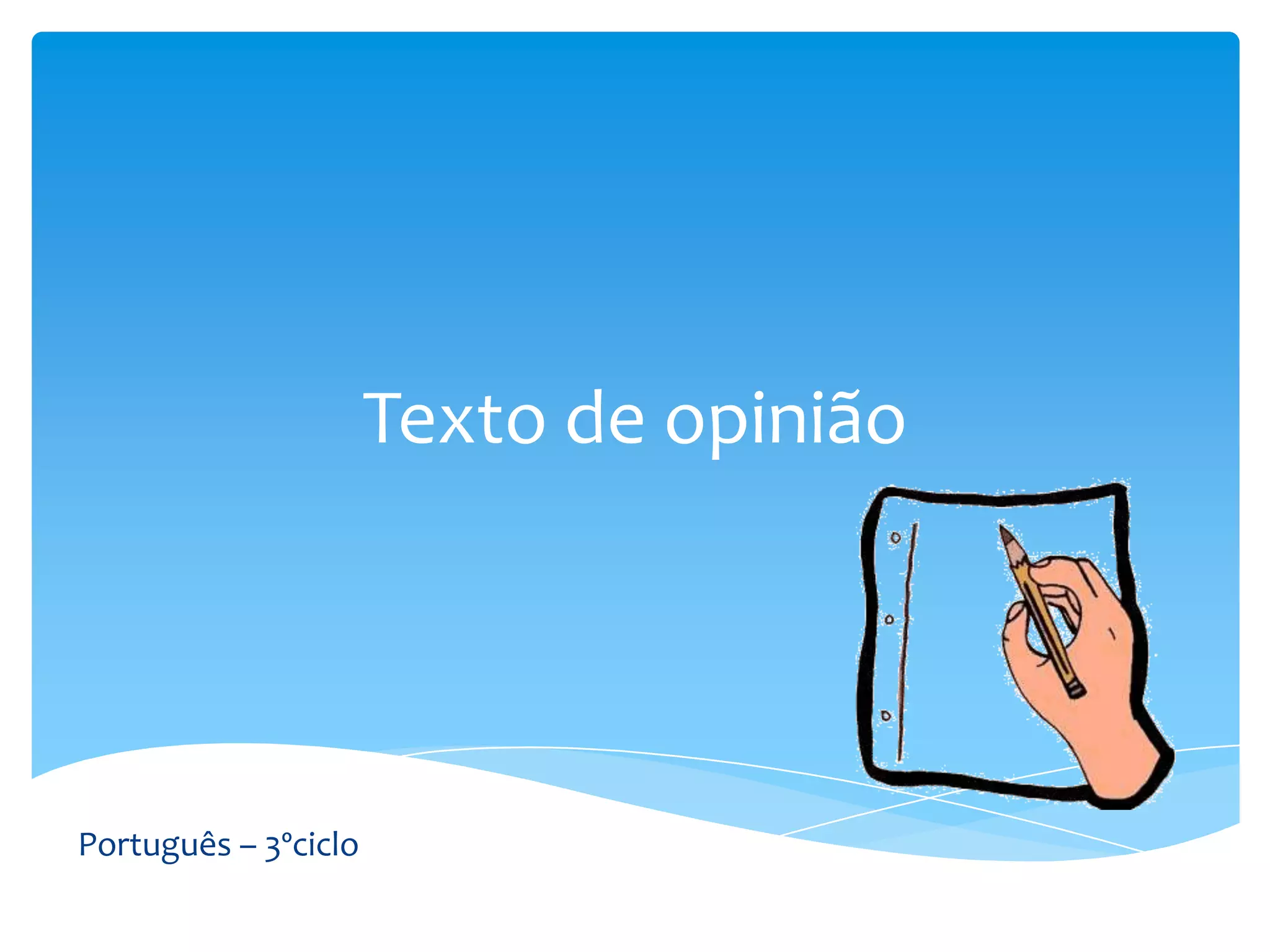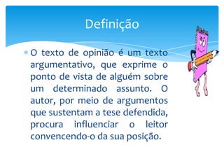 O documento descreve o texto de opinião como um texto argumentativo que expressa o ponto de vista do autor sobre um determinado assunto, utilizando argumentos para convencer o leitor. Ele explica a estrutura do texto de opinião, incluindo título, introdução, corpo, conclusão, e características como uso do presente do indicativo e expressões de opinião. Por fim, propõe uma tarefa de redação de uma crítica sobre um livro, filme ou álbum seguindo as etapas de planificação e revisão.