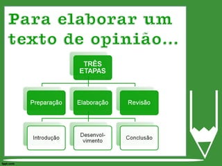 O documento fornece instruções para escrever um texto de opinião, incluindo listar opiniões sobre o tópico, argumentos a favor e contra cada opinião, e escolher e defender uma posição. Ele também fornece diretrizes para a introdução, desenvolvimento e conclusão, enfatizando a clareza da opinião e a justificação com um vocabulário apropriado.