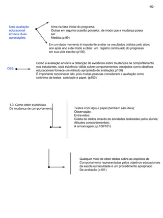 O documento discute os princípios básicos da avaliação educacional de acordo com Ralph W. Tyler. A avaliação deve (1) medir se os objetivos educacionais estão sendo alcançados, (2) envolver a coleta de dados no início e fim do programa para medir mudanças no comportamento dos alunos, e (3) usar vários métodos para coletar evidências como testes, observações e entrevistas. A avaliação é essencial para o desenvolvimento contínuo do currículo.
