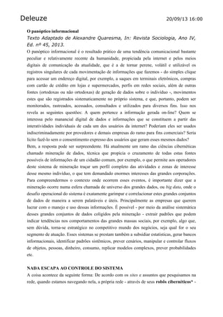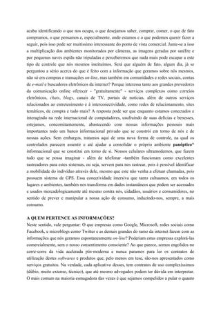 O documento discute o "panóptico informacional", onde dados pessoais de usuários da internet são coletados e usados comercialmente sem o consentimento dos usuários. Isso permite que empresas criem perfis detalhados sobre pessoas para fins de marketing. Embora os serviços online sejam gratuitos, os termos de uso raramente são lidos e permitem que as empresas explorem os dados.