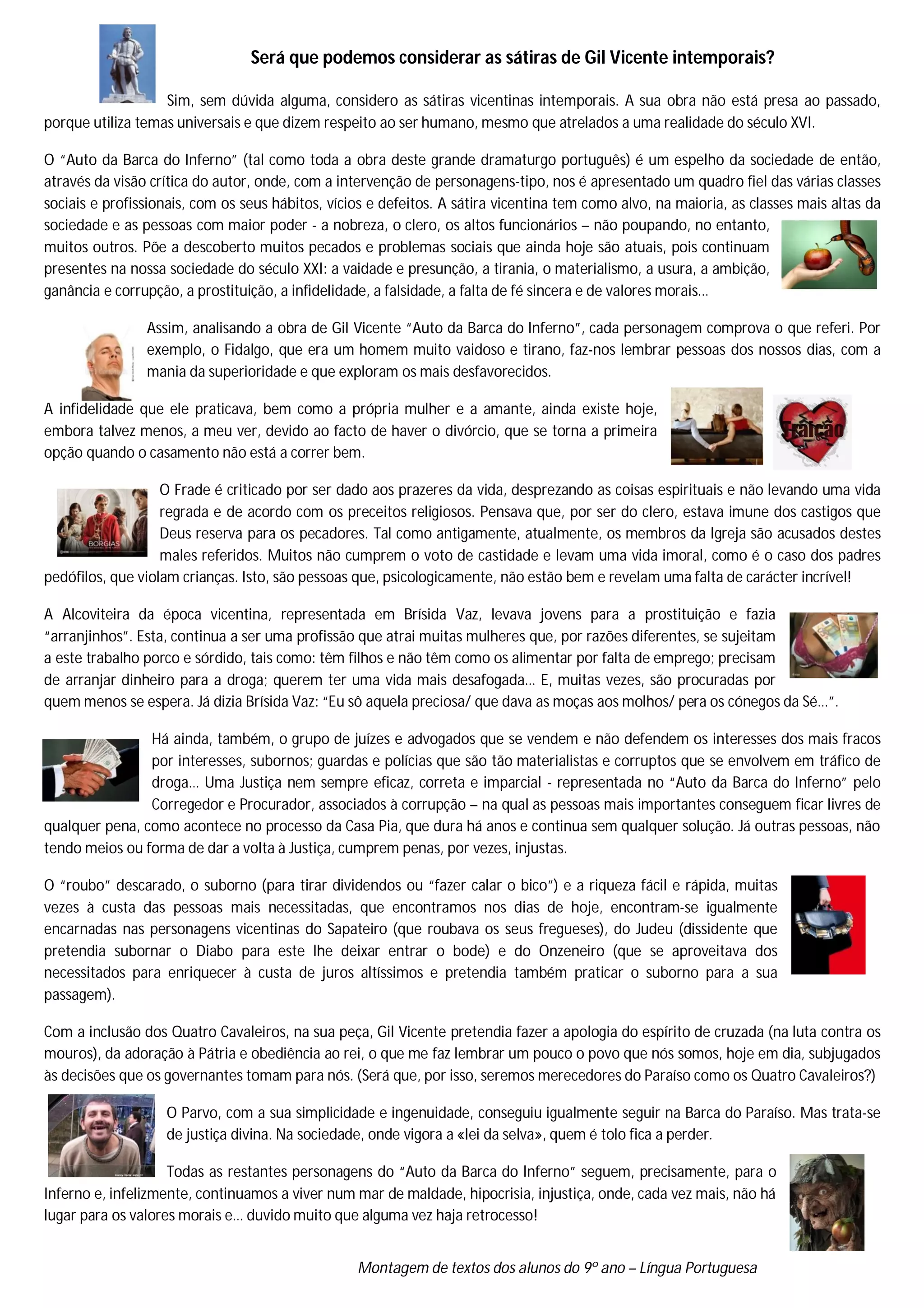 O documento discute se as sátiras de Gil Vicente são intemporais. Afirma que sim, pois abordam temas universais sobre a natureza humana, como vaidade, ambição e corrupção, que ainda são relevantes hoje. Analisa a peça "Auto da Barca do Inferno" e como cada personagem representa pecados e problemas sociais presentes nos dias atuais, como abuso clerical, prostituição e corrupção política. Conclui que infelizmente continuamos a viver em uma sociedade de maldade e injustiça, onde valores morais são cada