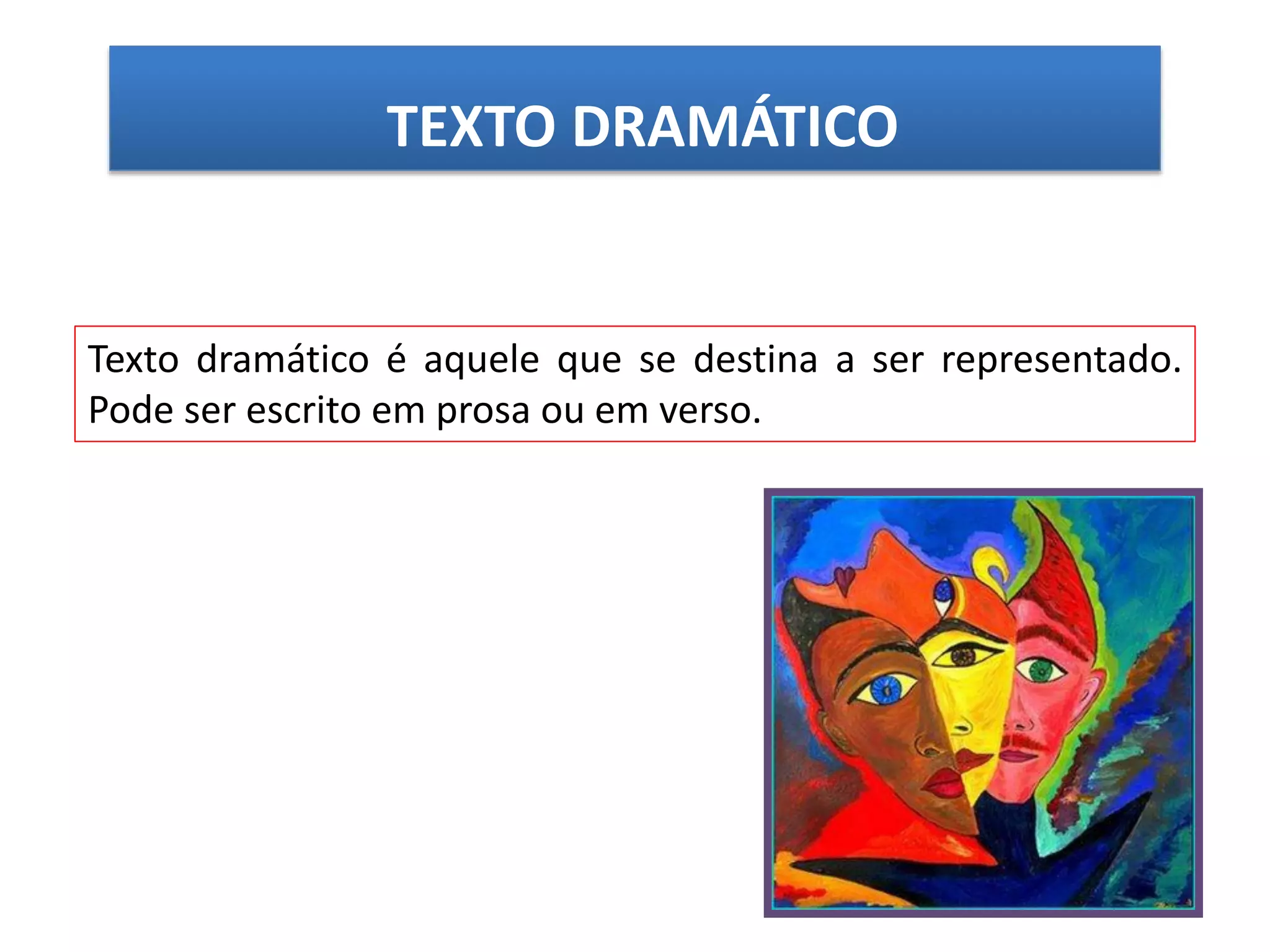 Um texto dramático é escrito para ser representado e pode incluir prosa ou verso. É composto por diálogos entre personagens e didascálias para atores e diretores. Uma peça tipicamente inclui uma lista de personagens, indicações de cena, e estrutura interna com exposição, conflito e desfecho. Personagens podem ser planas ou modeladas e o espaço e tempo são importantes elementos.