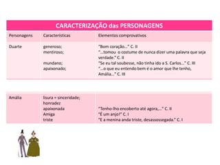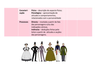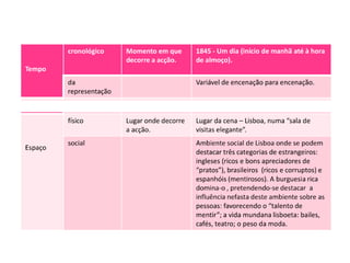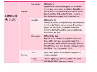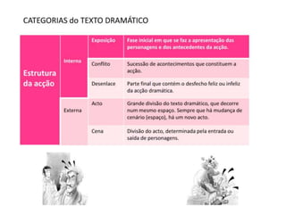 O documento descreve as características principais de um texto dramático, incluindo sua estrutura interna e externa, modalidades de discurso, categorias como ação, personagens e espaço/tempo, intenções do autor e processos cômicos. Resume também as principais formas do gênero dramático e os intervenientes no texto dramático.