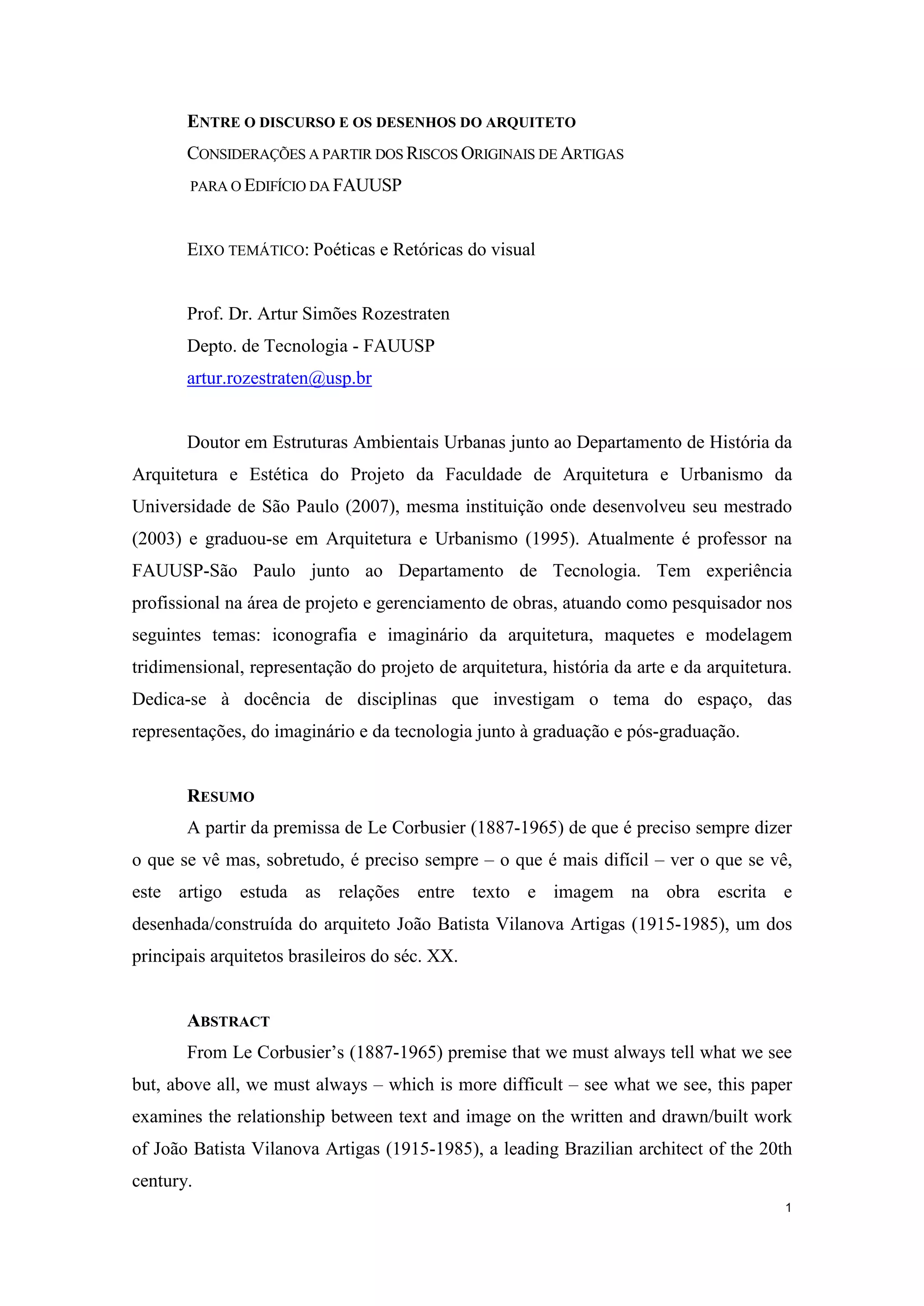 Este documento resume os principais pontos do artigo "E TRE O DISCURSO E OS DESE HOS DO ARQUITETO" sobre as relações entre texto e imagem na obra do arquiteto brasileiro João Batista Vilanova Artigas. O artigo analisa os desenhos originais de Artigas para o projeto da FAUUSP, comparando-os com seus escritos sobre o processo de projeto. Discute como os desenhos revelam um processo criativo em evolução, não apenas representações de ideias pré-concebidas. Também reflete sobre as diferenças entre texto