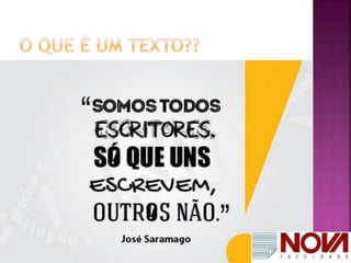 O documento discute o que é um texto e suas características essenciais. Apresenta sete fatores de textualidade, sendo eles: intencionalidade, informatividade, aceitabilidade, situacionalidade, coerência, coesão e intertextualidade. Explica que esses fatores tornam uma sequência de frases em um texto coeso e coerente.