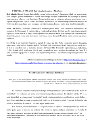 O documento descreve um encontro sobre a construção sociocultural da infância no Brasil que inclui a exibição e discussão do filme "A Invenção da Infância". O filme mostra como a noção de infância varia entre classes sociais no Brasil, retratando crianças que trabalham em canaviais e pedreiras contrastando com as atividades extracurriculares de crianças de classe média.
