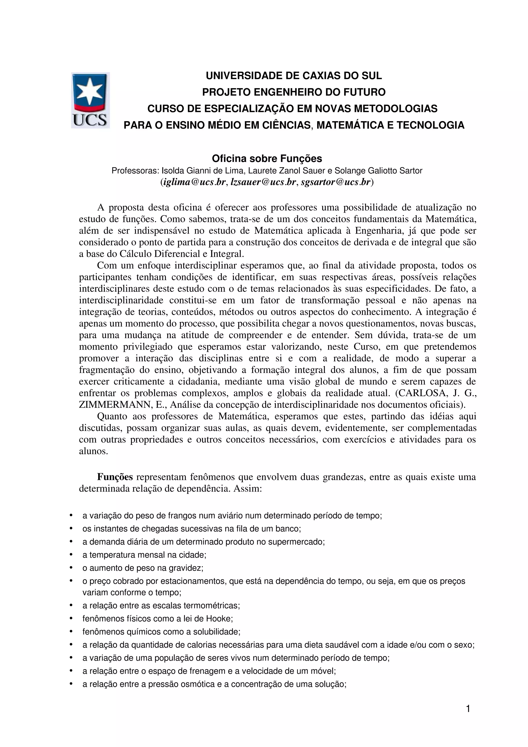 1) O documento descreve uma oficina sobre funções oferecida a professores com o objetivo de atualizá-los sobre este conceito fundamental da matemática e da engenharia.