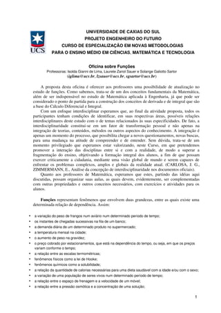 Este documento descreve uma oficina sobre funções para professores, com o objetivo de atualizá-los sobre este importante conceito matemático. A oficina enfatiza uma abordagem interdisciplinar de funções e seu papel na engenharia. Modelos matemáticos são discutidos como uma forma de representar fenômenos do mundo real.