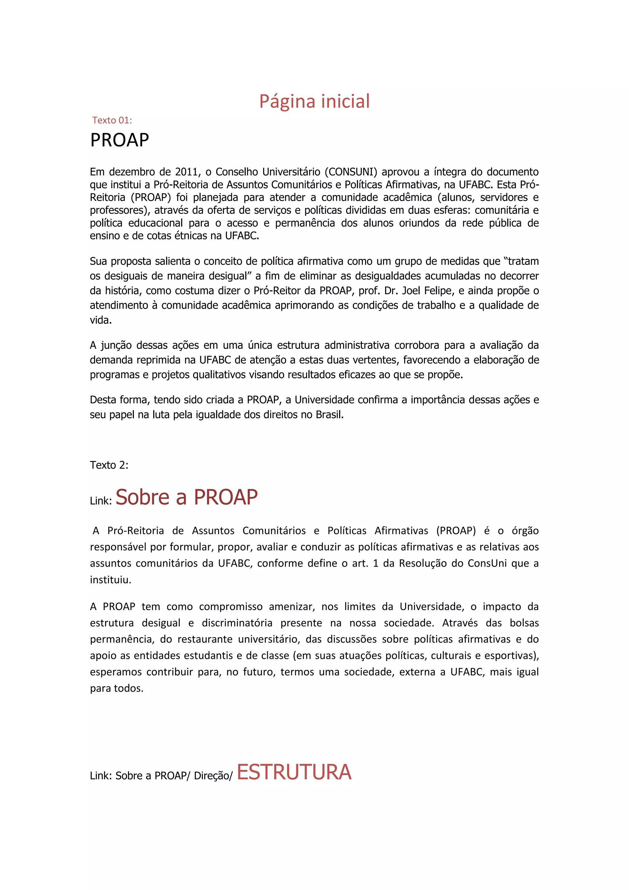 O documento descreve a criação da Pró-Reitoria de Assuntos Comunitários e Políticas Afirmativas (PROAP) na Universidade Federal do ABC (UFABC) em dezembro de 2011 para oferecer serviços à comunidade acadêmica e políticas de acesso e permanência de alunos de escolas públicas e cotas étnicas. A PROAP tem como objetivo amenizar desigualdades por meio de bolsas, refeitório universitário e apoio a entidades estudantis.