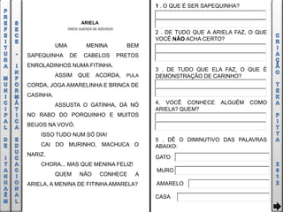 O documento descreve a menina Ariela, que gosta de brincar pulando corda, jogando amarelinha e brincando de casinha. Ela também assusta o gatinho e dá beijos na vovó.