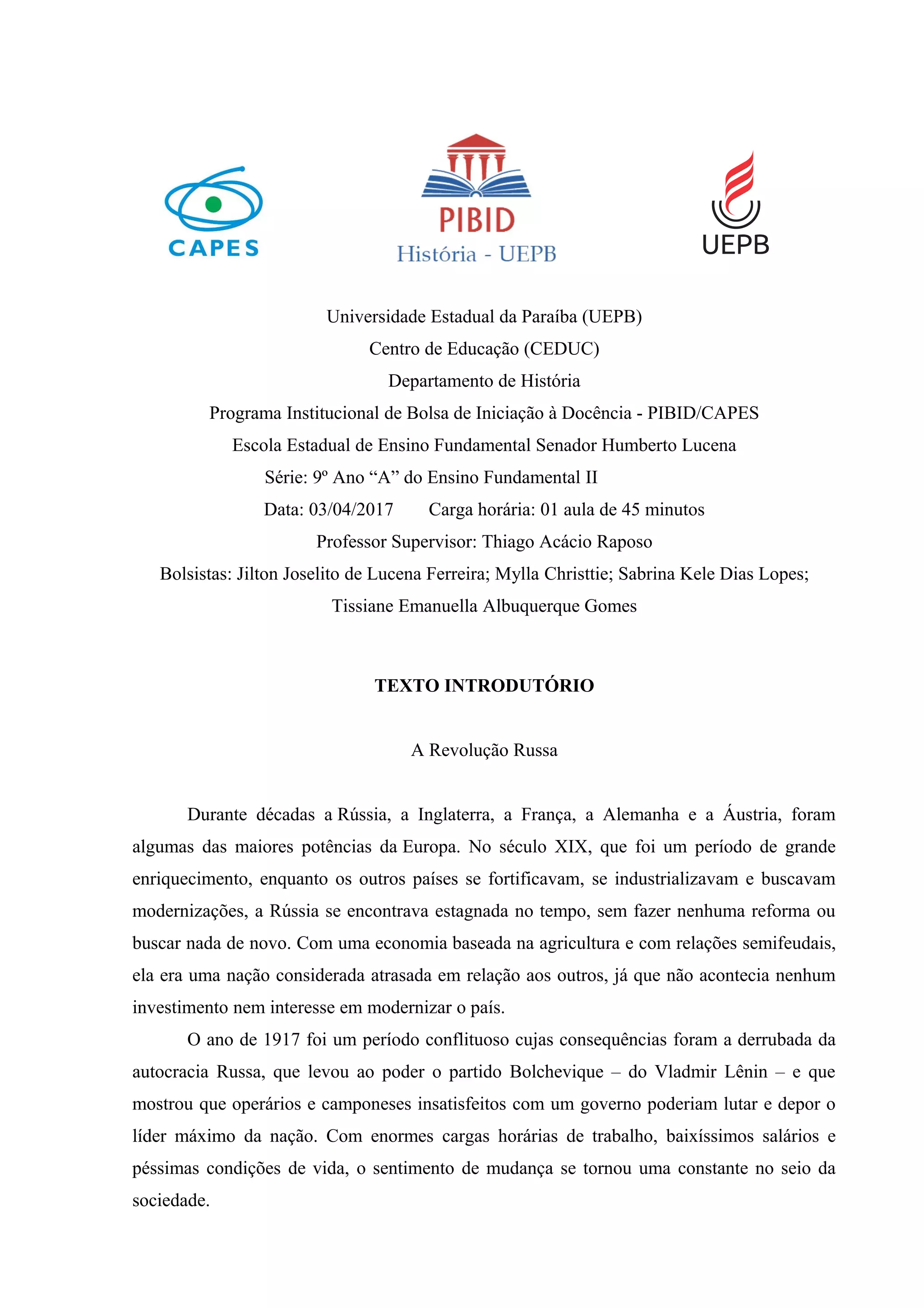 O documento aborda a Revolução Russa de 1917, destacando a estagnação da Rússia em comparação com outras potências europeias e suas condições socioeconômicas precárias. A revolução resultou na queda da autocracia e na ascensão do partido bolchevique liderado por Lenin, precedendo a era de Stalin e a formação da URSS. Temas adicionais incluem as guerras civis que ocorreram após a Primeira Guerra Mundial e as consequências sociais e econômicas da revolução.