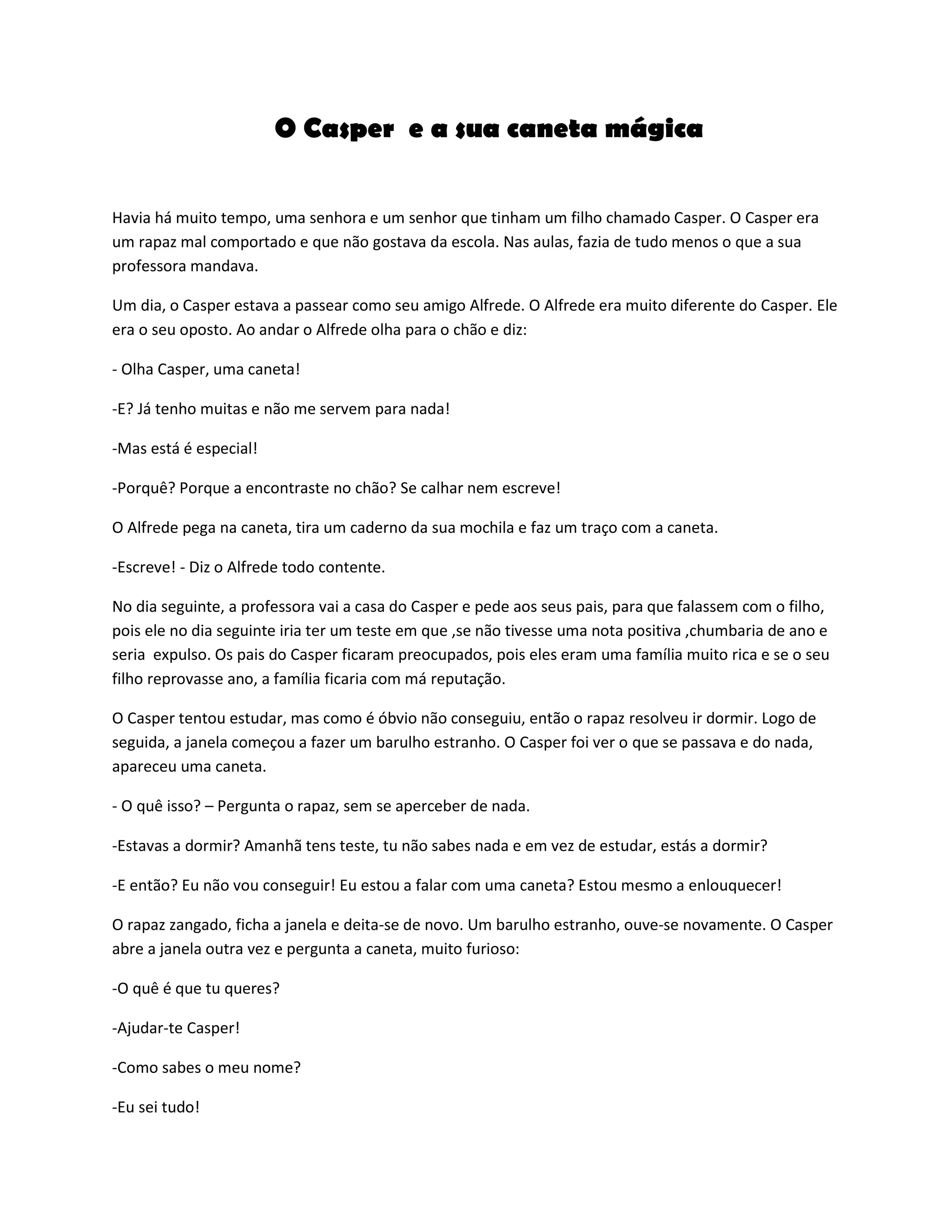 O Casper era um estudante problemático que não gostava de estudar. Um dia, ele encontrou uma caneta mágica que podia ler mentes e ajudá-lo a estudar. Na noite antes de um importante teste, a caneta apareceu na janela do Casper e o ajudou a estudar. No dia seguinte, com a ajuda da caneta mágica, o Casper teve um excelente desempenho no teste. Seus pais ficaram orgulhosos e a caneta foi guardada como um objeto valioso.