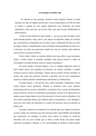 O documento descreve a trajetória da autora com a tecnologia ao longo de sua vida, desde a infância em uma fazenda paulista até os dias atuais como professora. Ela observou a rápida evolução tecnológica, como a chegada do homem à lua e a popularização da televisão colorida. Seus primeiros contatos com computadores e internet ocorreram quando já era professora.
