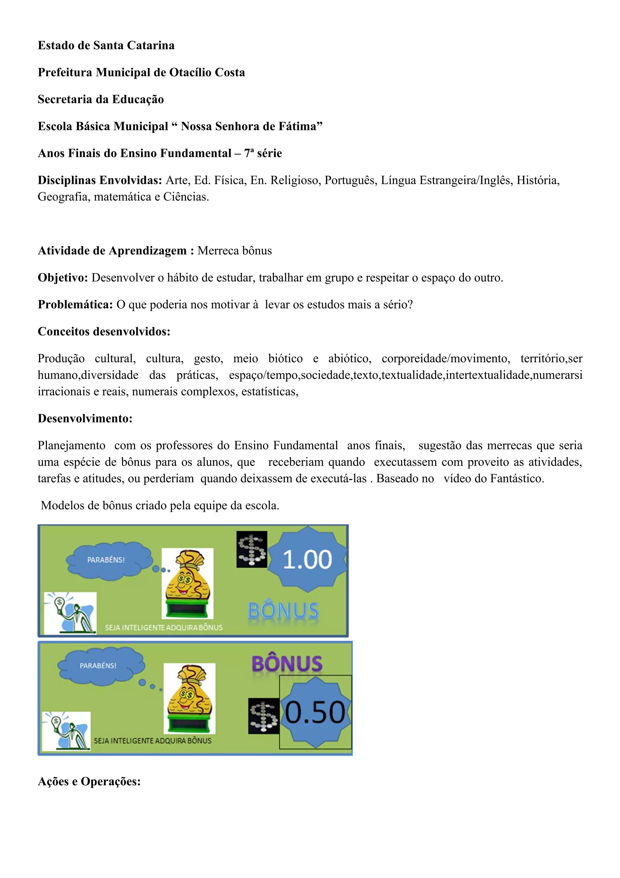A escola municipal Nossa Senhora de Fátima implementou um sistema de "merrecas bônus" para motivar os alunos do 7o ano a levarem os estudos mais a sério. Os alunos ganham ou perdem merrecas dependendo de seu comportamento e desempenho, e podem trocá-las por recompensas. A tabela criada lista as ações que geram débitos ou créditos de merrecas. A atividade será avaliada no segundo bimestre para verificar se melhorou a responsabilidade com a aprendizagem