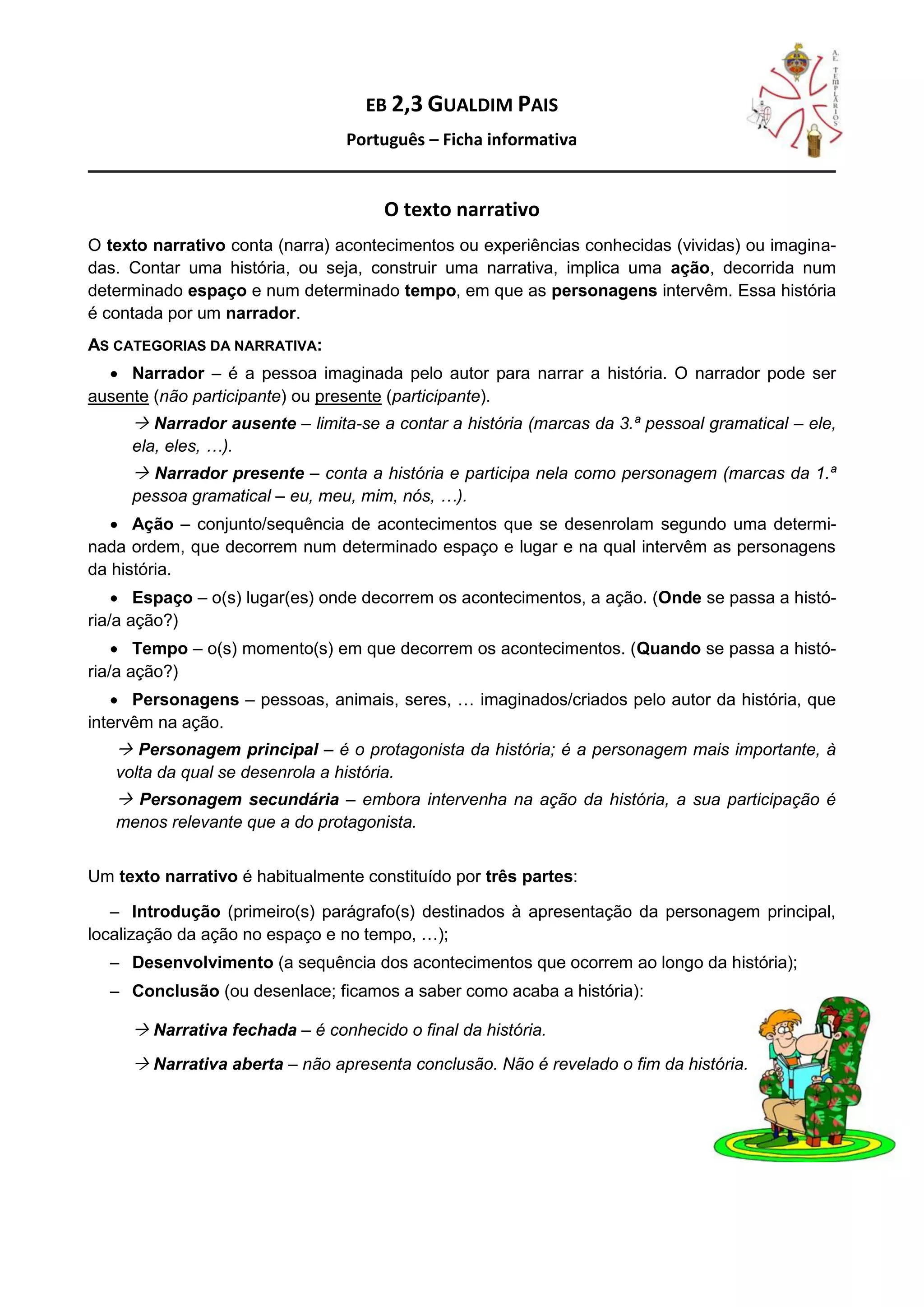 Este documento fornece informações sobre o texto narrativo, definindo suas principais categorias como narrador, ação, espaço, tempo e personagens. Explica que uma narrativa geralmente contém introdução, desenvolvimento e conclusão. Apresenta um exemplo de conto tradicional sobre um gato e um rato.
