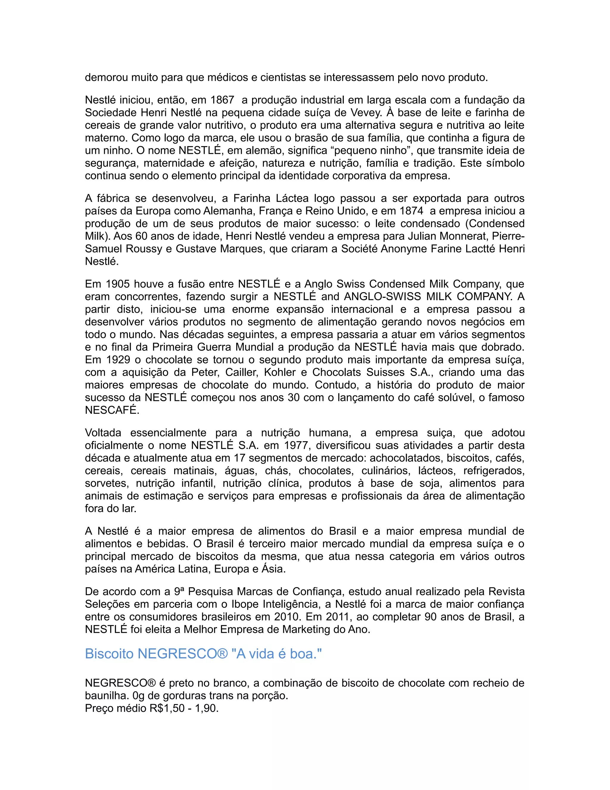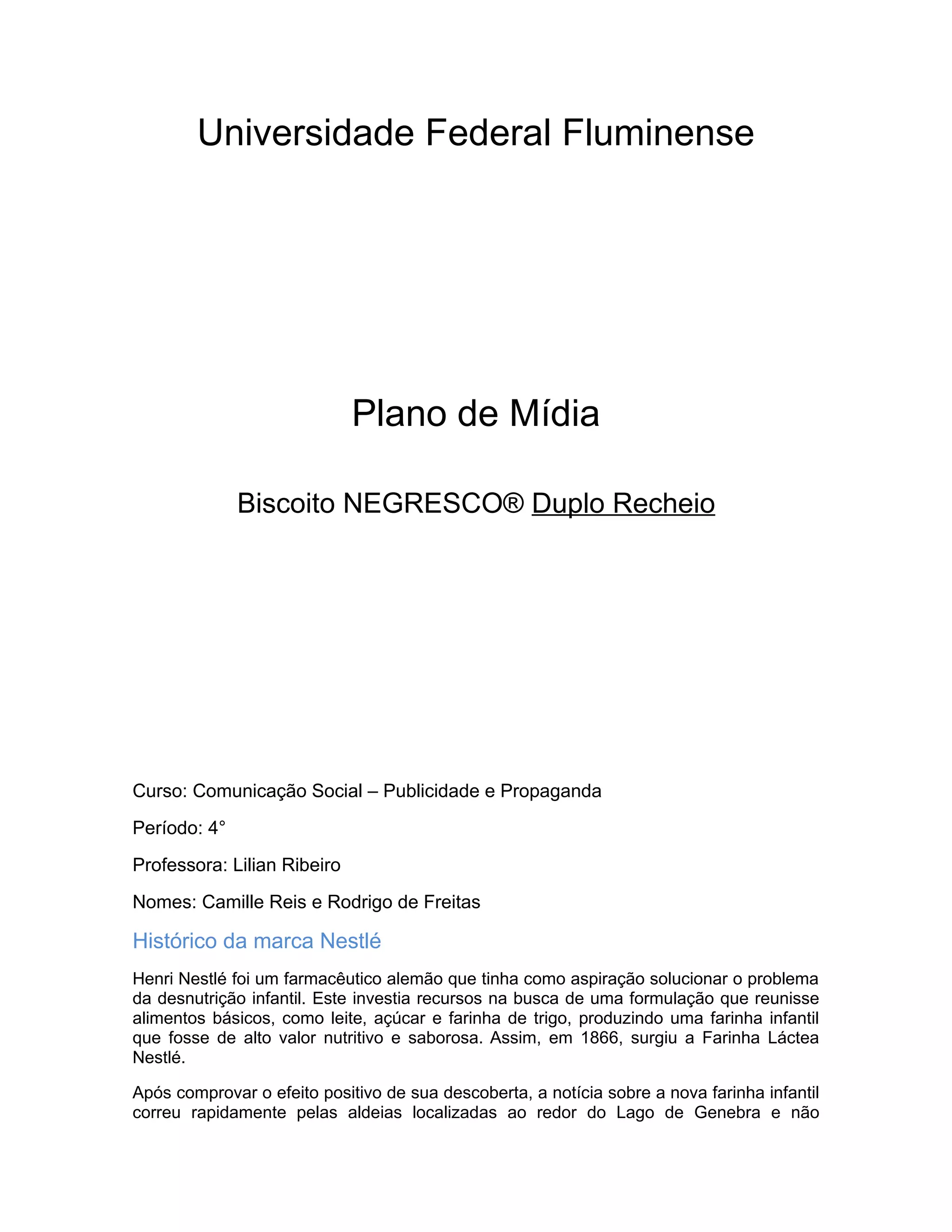 [1] O documento descreve o histórico da marca Nestlé e do biscoito NEGRESCO®, incluindo o lançamento do novo NEGRESCO® Duplo Recheio. [2] O alvo do NEGRESCO® Duplo Recheio são jovens de 18 a 25 anos e o posicionamento é de um produto mais exclusivo. [3] Os principais concorrentes são os biscoitos PASSATEMPO® e BONO® da Nestlé e a linha CREAMY da Bauducco.