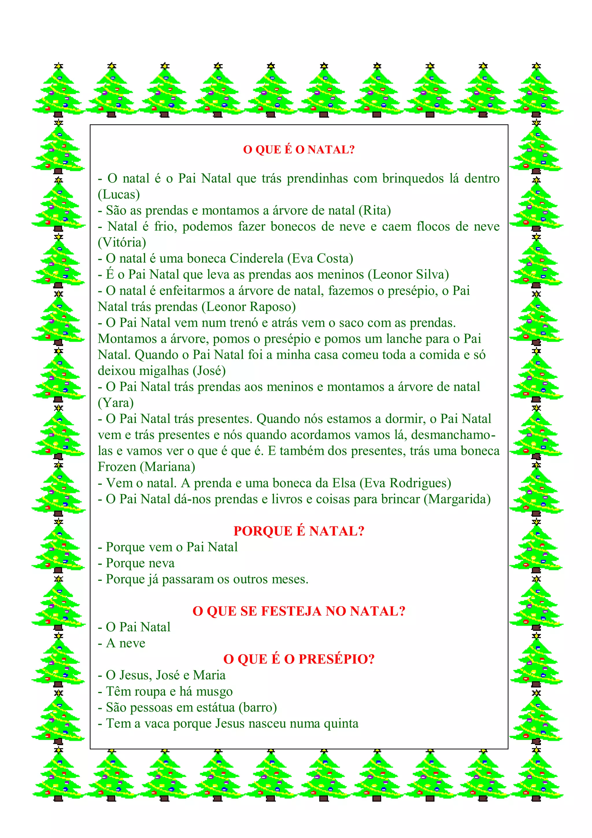 O documento contém respostas de crianças sobre o que é o Natal. Muitas crianças mencionam que o Natal envolve receber presentes do Pai Natal, decorar a árvore de Natal e montar o presépio com José, Maria e o Menino Jesus. Algumas crianças também falam sobre a neve e fazerem bonecos de neve no inverno.
