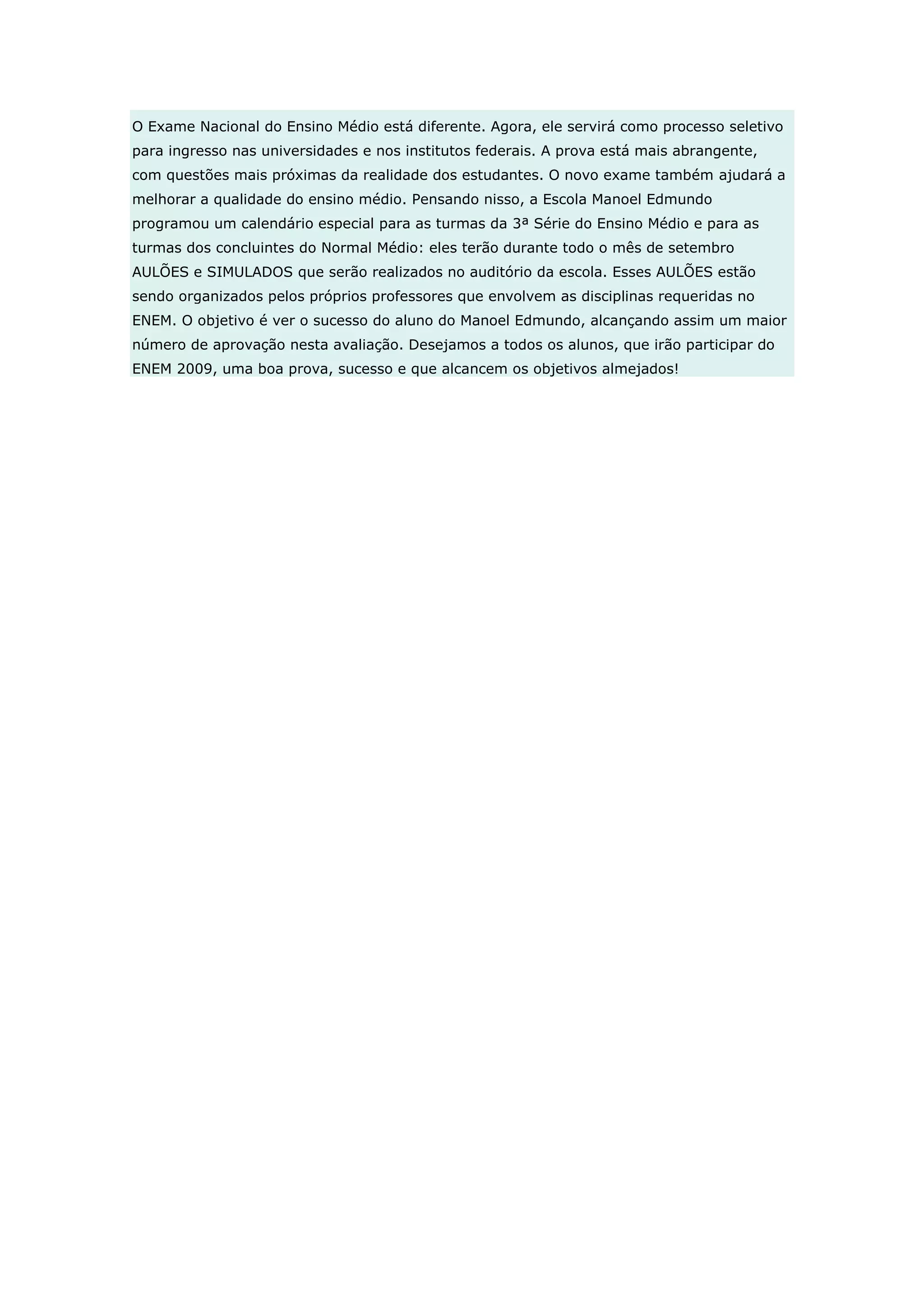 O ENEM está mudando para selecionar estudantes para universidades. A escola Manoel Edmundo está organizando aulas extras e simulados em setembro para ajudar os alunos da 3a série do ensino médio e do curso normal médio a se prepararem melhor para as mudanças no exame.