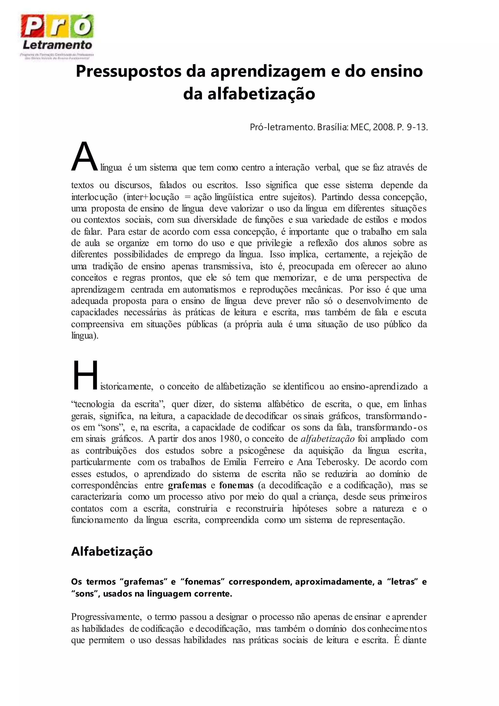 A linguagem é um sistema baseado na interação verbal através de textos orais ou escritos. O ensino de língua deve valorizar o uso da língua em diferentes contextos sociais. Historicamente, alfabetização se referia ao ensino da escrita, mas agora inclui também o uso social da leitura e escrita. Letramento refere-se ao domínio da cultura escrita e sua aplicação em práticas sociais. Uma proposta educacional eficaz concilia alfabetização e letramento de forma articulada.