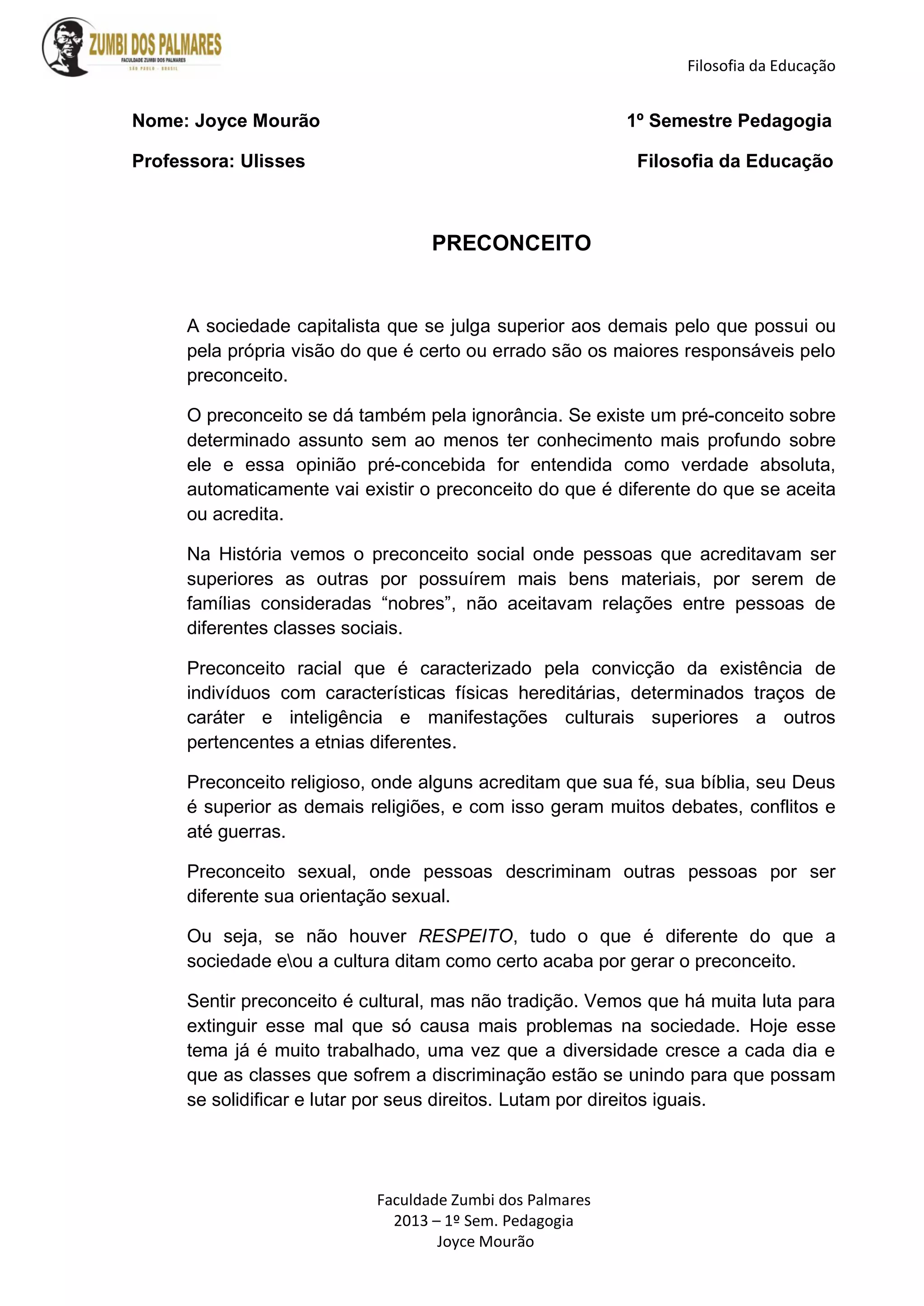 O documento discute os tipos de preconceito na sociedade, incluindo preconceito social, racial, religioso e sexual. Argumenta que o preconceito é causado pela ignorância e visão de que certos grupos são superiores. Defende que o respeito às diferenças deve ser ensinado desde cedo para que as crianças possam lidar com a diversidade sem preconceitos.