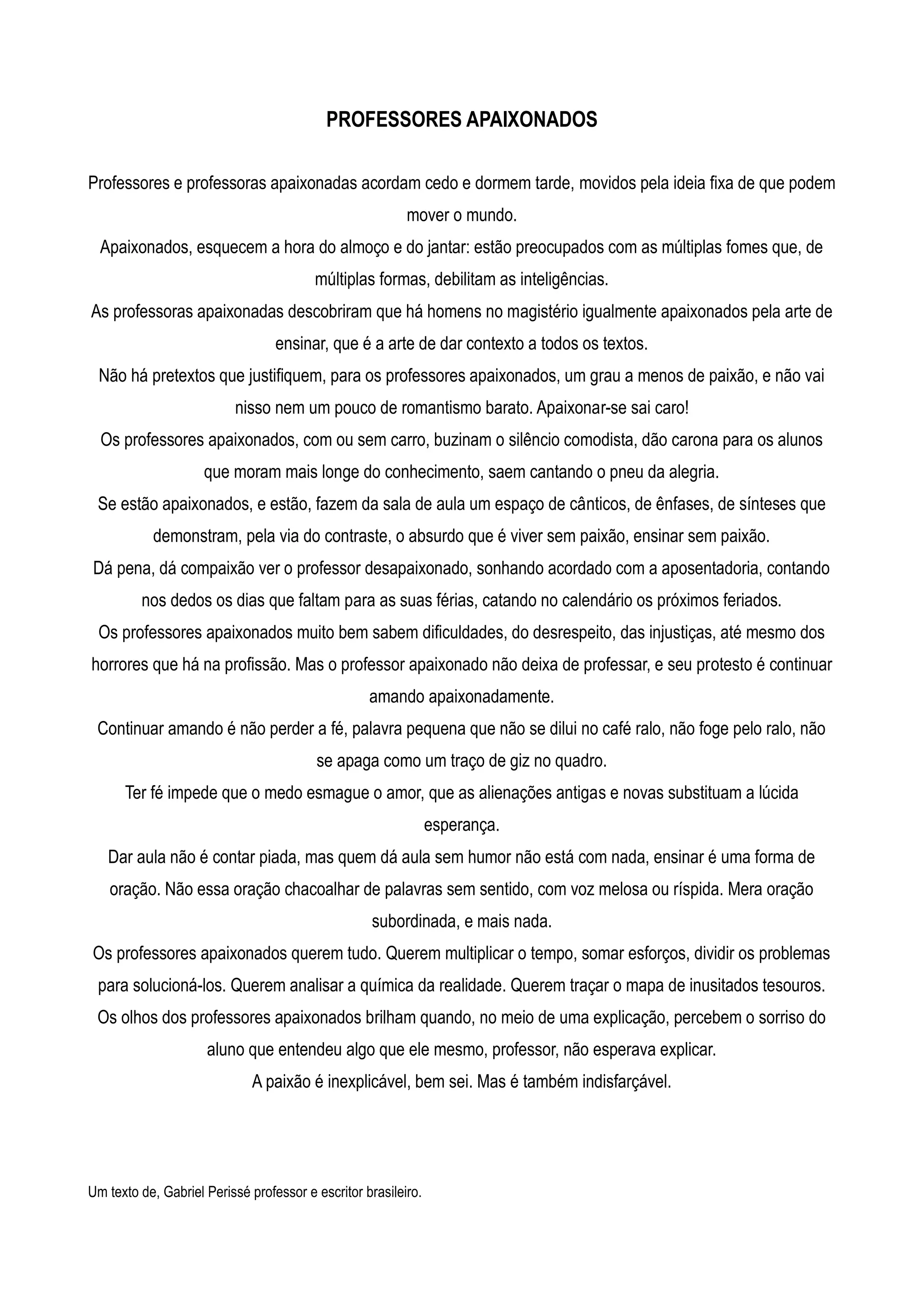 O texto descreve professores apaixonados por seu trabalho que acordam cedo e dormem tarde movido pela ideia de mudar o mundo. Eles se esquecem de comer preocupados em alimentar as mentes dos alunos e descobrem outros professores igualmente apaixonados. Professores apaixonados transformam a sala de aula em um espaço dinâmico e engajado apesar das dificuldades da profissão.