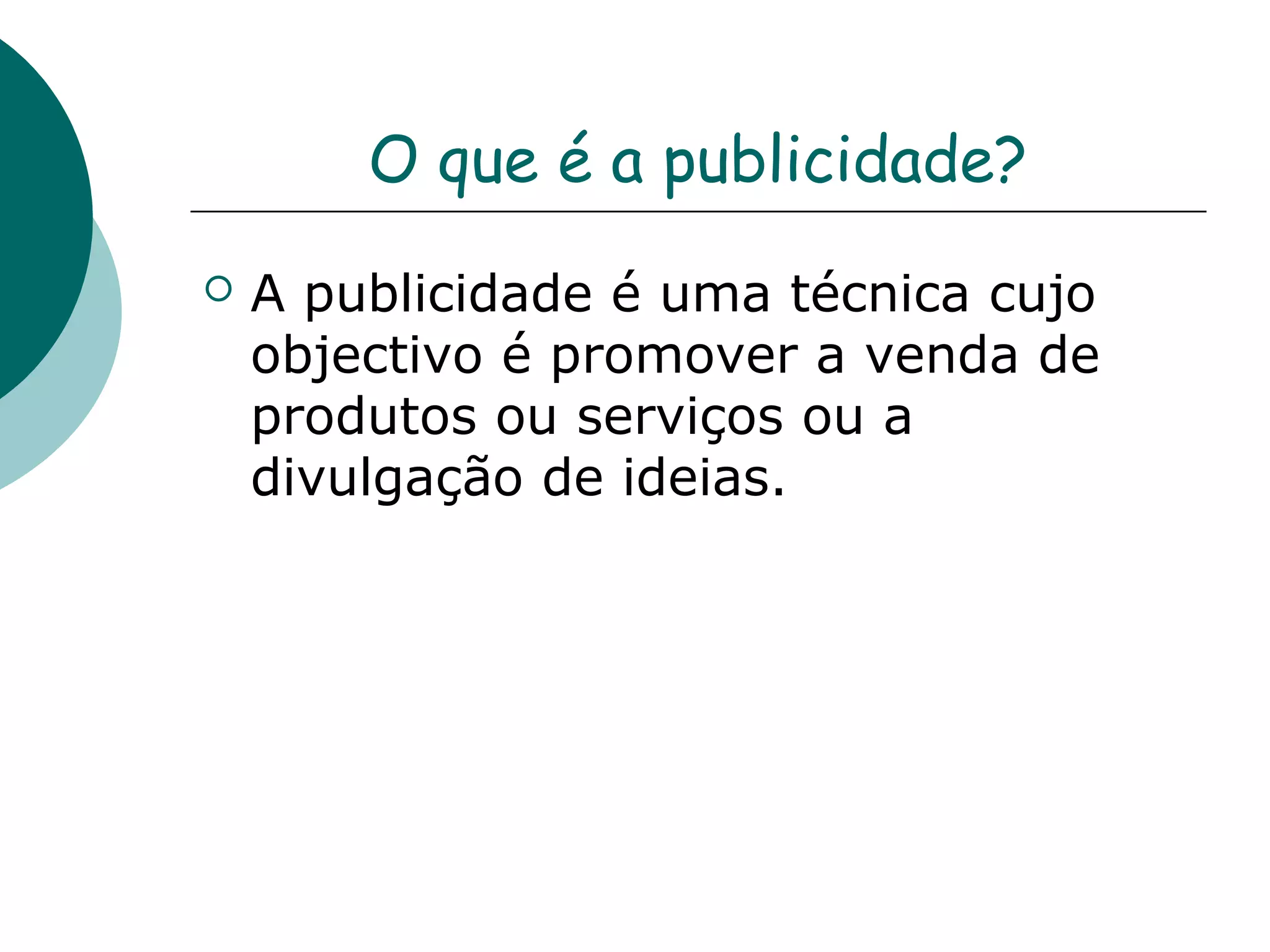O que éa publicidade?  A publicidade é uma técnica cujo objectivo é promover a venda de produtos ou serviços ou a divulgação de ideias.