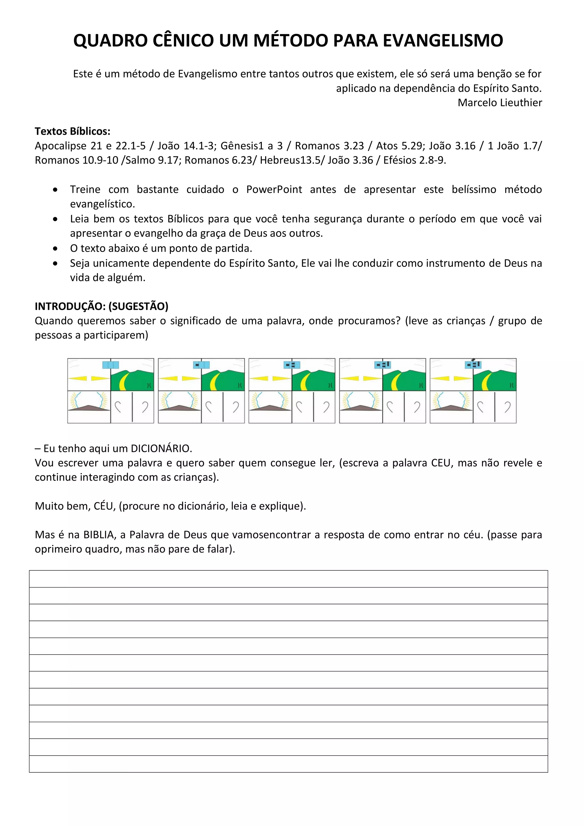 O documento apresenta um método de evangelismo que enfatiza a dependência do Espírito Santo. Utilizando uma abordagem lúdica, ele explora conceitos bíblicos como céu, pecado e a salvação através de Jesus Cristo. O material é voltado para orientar a apresentação do evangelho de forma clara e acessível, especialmente para crianças.