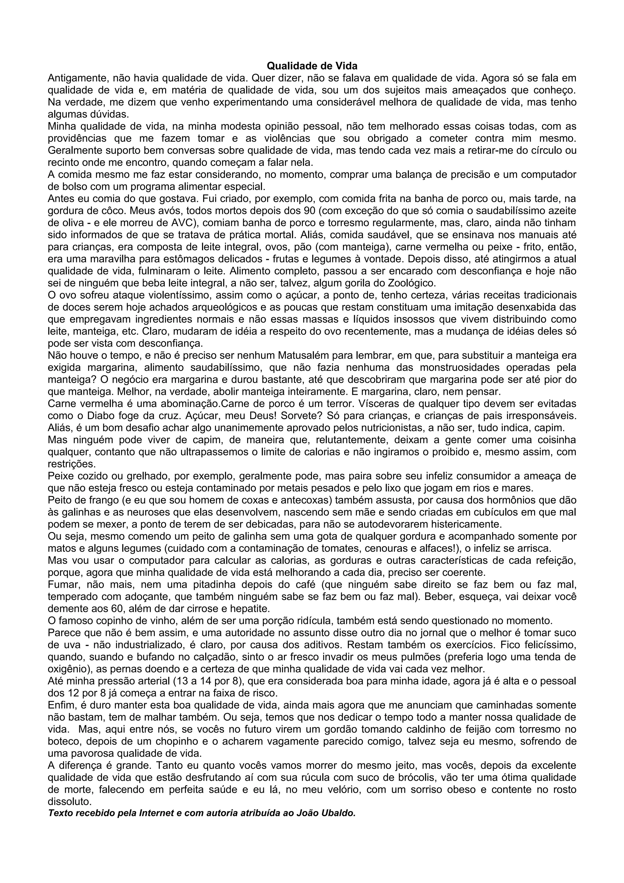 O documento discute ironicamente a noção moderna de qualidade de vida e as restrições impostas pelos nutricionistas. O autor expressa dúvidas sobre as melhorias em sua qualidade de vida e reluta em participar de conversas sobre o assunto. Ele questiona as mudanças frequentes nas recomendações nutricionais e sente que é difícil manter uma boa qualidade de vida com tantas restrições e obrigações.