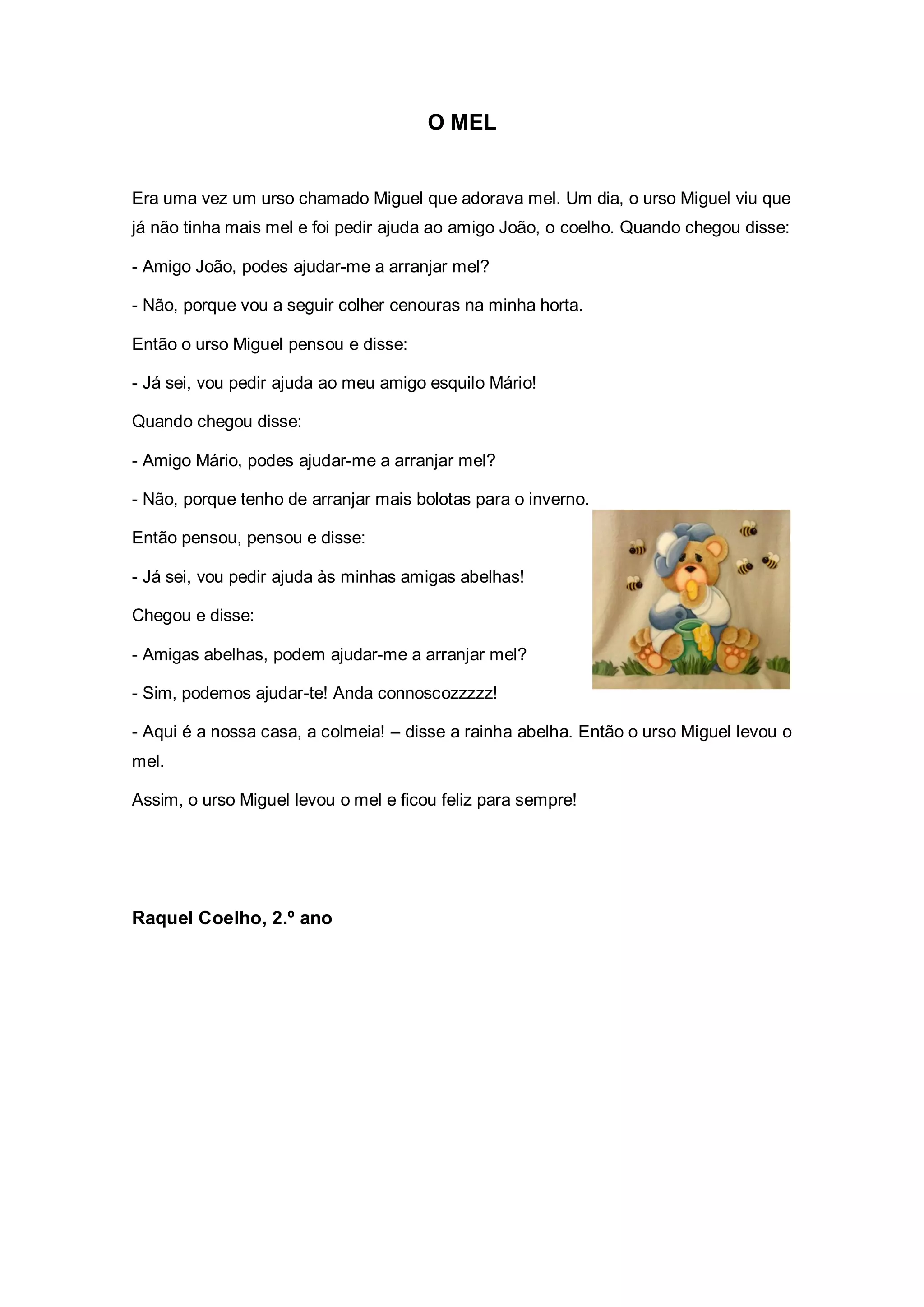 O urso Miguel queria mel, mas o coelho João e o esquilo Mário estavam ocupados, então as abelhas ofereceram-lhe mel da sua colmeia, deixando o urso Miguel feliz para sempre.