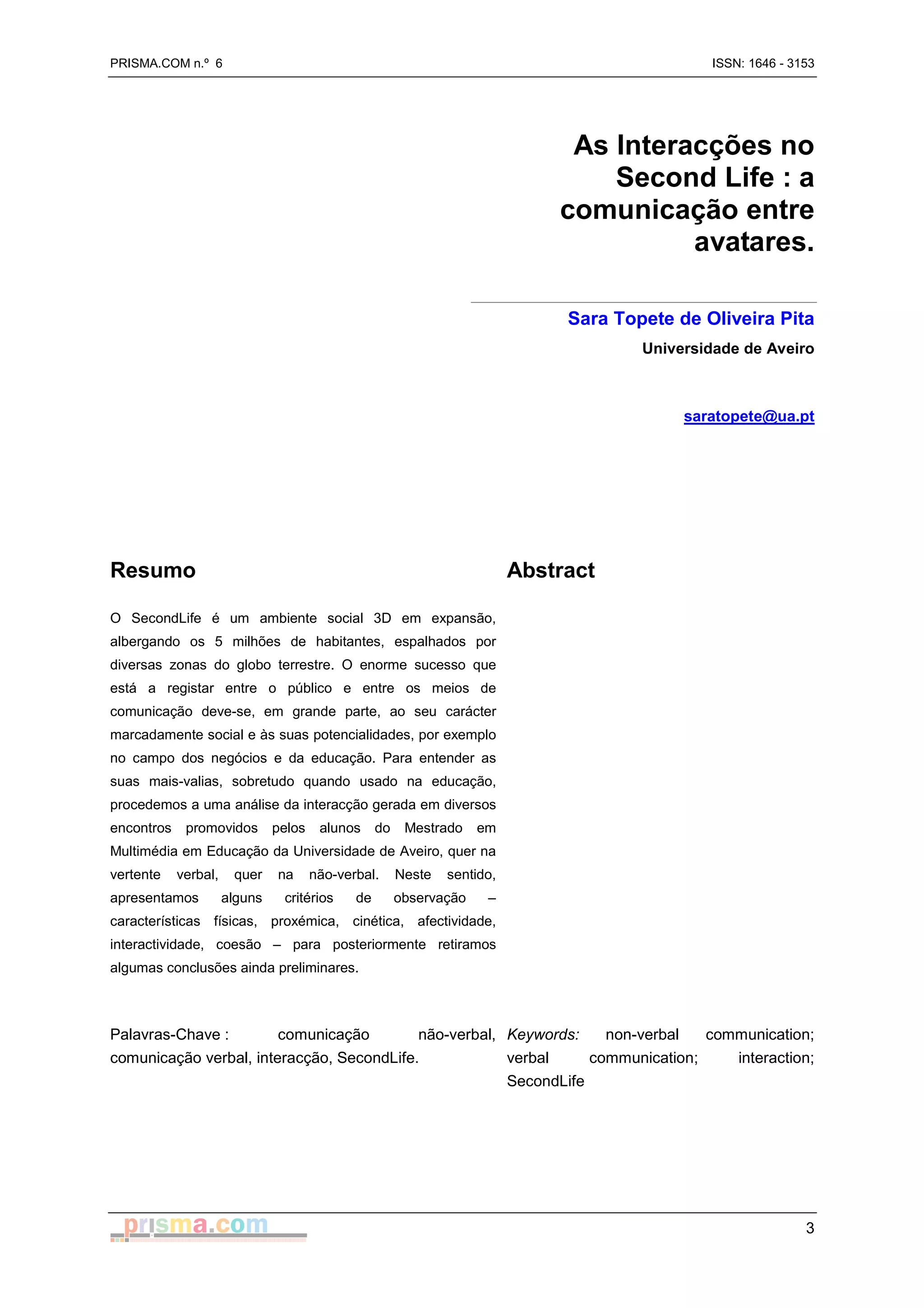 1) O documento descreve uma análise da interação entre avatares no Second Life, incluindo comunicação verbal e não-verbal.