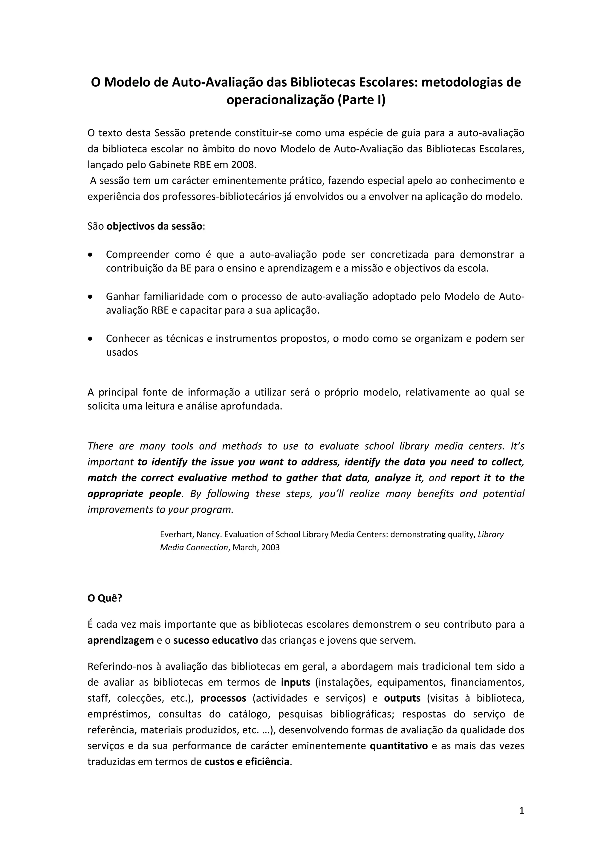 Este documento discute a auto-avaliação de bibliotecas escolares no Portugal. Ele explica que a avaliação deve se concentrar nos resultados e impactos da biblioteca, ao invés de apenas métricas e desempenho. Além disso, a avaliação da biblioteca deve estar alinhada com a avaliação geral da escola. Finalmente, o documento reconhece que medir o impacto exato da biblioteca no sucesso educacional é complexo devido a muitas variáveis.