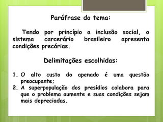 O documento discute as precárias condições do sistema carcerário brasileiro, que apresenta alto custo por preso e superlotação nos presídios, dificultando a reinserção social dos detentos.
